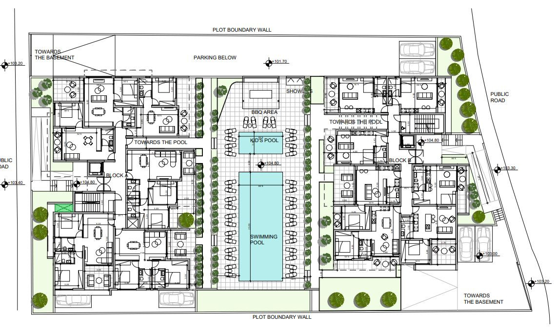 Nestled between the blocks is a tranquil swimming pool, creating a central oasis for relaxation. Enjoy the refreshing waters or watch your little ones play in their dedicated kid's pool, surrounded by the beauty of nature.