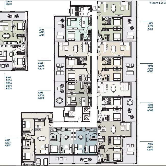 The project consists of 2 blocks of 5 and 3 floors; total of 60 apartments (42*1-bedroom apartments, 18 * 2-bedroom apartments)