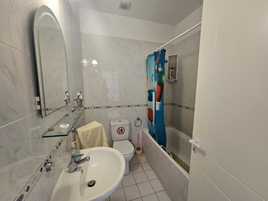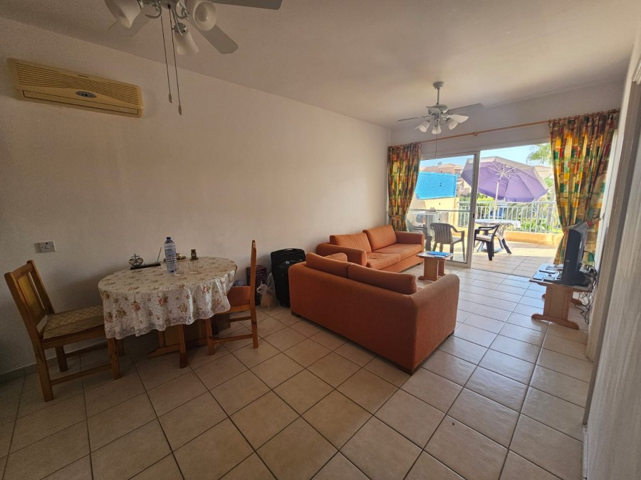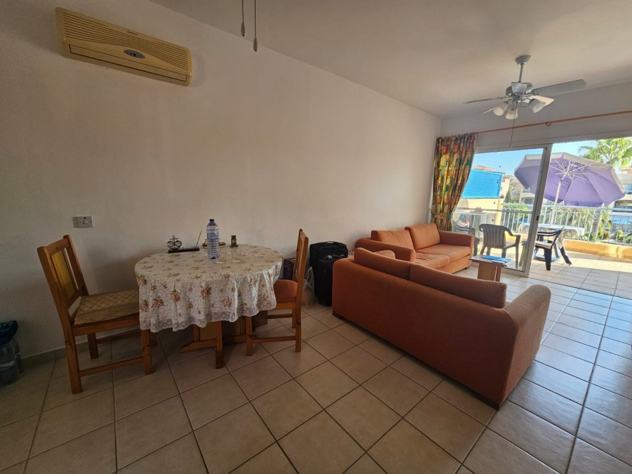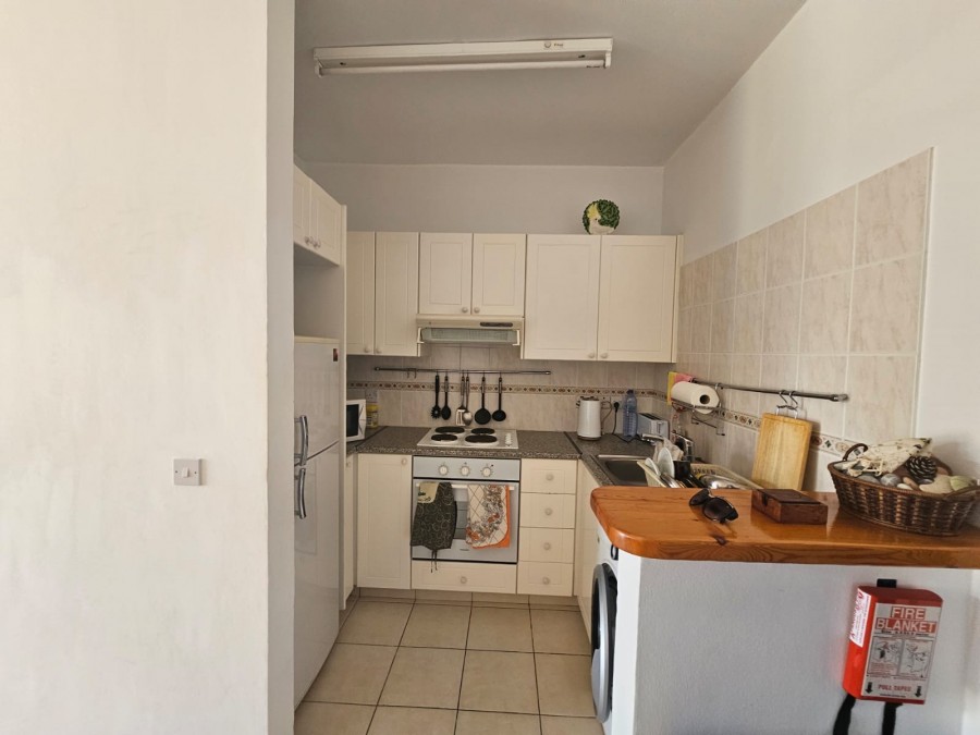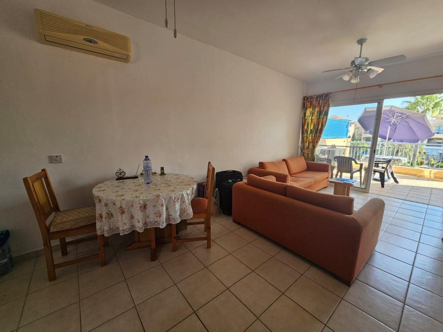 This 1 bedroom second-floor apartment offers an open-plan living/dining area with a partly separated kitchen, one double bedroom, and a family bathroom. The apartment has a view of the communal pool and green area.