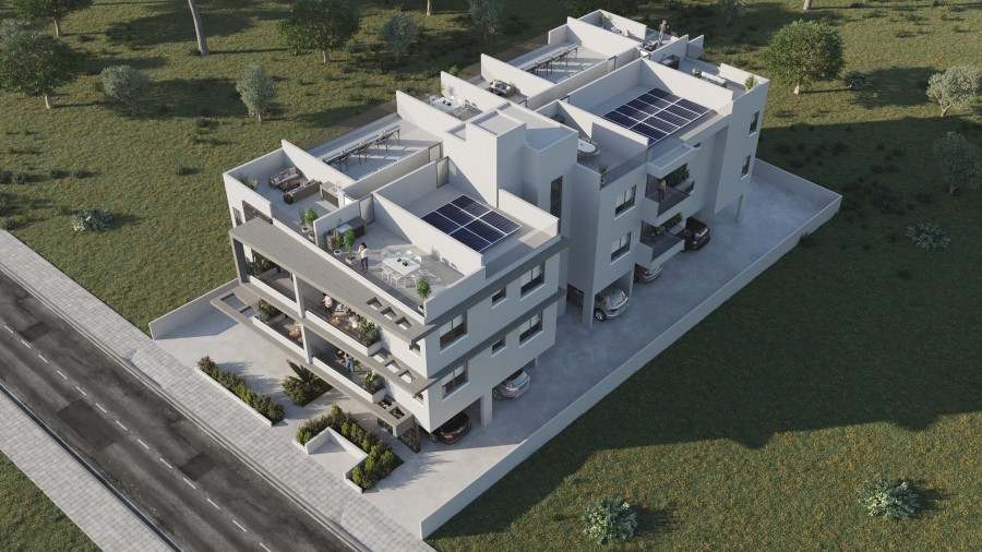 This contemporary residential development is located in Oroklini, Larnaca, just 2 kilometers from the beach and 8 kilometers from the city center. Comprising 14 apartments—eight one-bedroom and six two-bedroom units—the complex offers modern living spaces with open-plan kitchens, cozy bedrooms, and spacious verandas. Select second-floor apartments feature private roof gardens, providing additional outdoor space. Each unit includes a covered parking space and a storage room on the ground floor. The building is equipped with an elevator and boasts high-quality finishes such as marble flooring in the lobby, granite kitchen countertops, and double-glazed thermal aluminum windows. With an energy efficiency rating of A+, the project is designed for comfortable and sustainable living. Construction is expected to begin in early 2025, with completion anticipated by summer 2026.