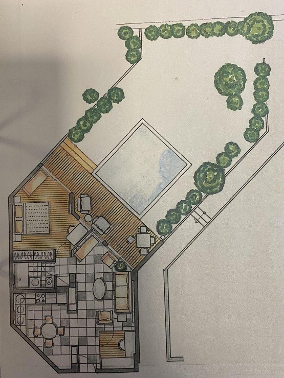 It has private swimming pool. Close to all amenities and just 1 minute walking distance from the beach.