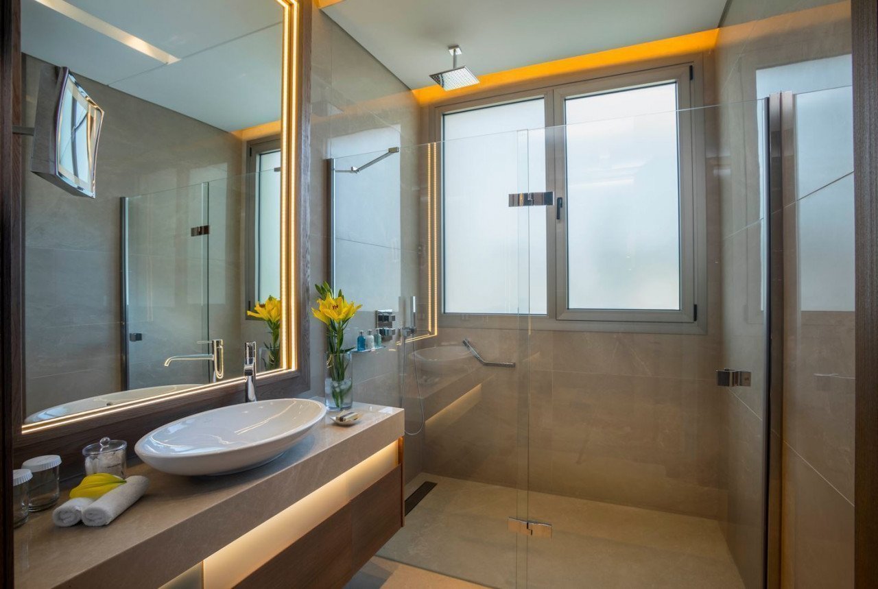 The brand new 2-bedroom residence represents the ultimate in luxury living.  The apartment consists of a living, dining area with an open plan fully equipped kitchen. The spacious bedrooms both with ensuite luxury bathrooms have ample wardrobes and storage space and there is an additional guest WC off the living room. The kitchen is fully equipped with state of the art Miele equipment. The luxurious living room with light summer cool finishes and marble floors is furnished with Flexform furniture and a 65” Samsung curved UHD TV.  The spacious patio offers outdoor dining and relaxing lounge space with amazing sea and city views. These Residences can accommodate up to five persons. This impressive two bedroom Residence offers over 240sqm of living space where you can truly relax and experience a unique and unforgettable stay in the privacy of a home away from home.