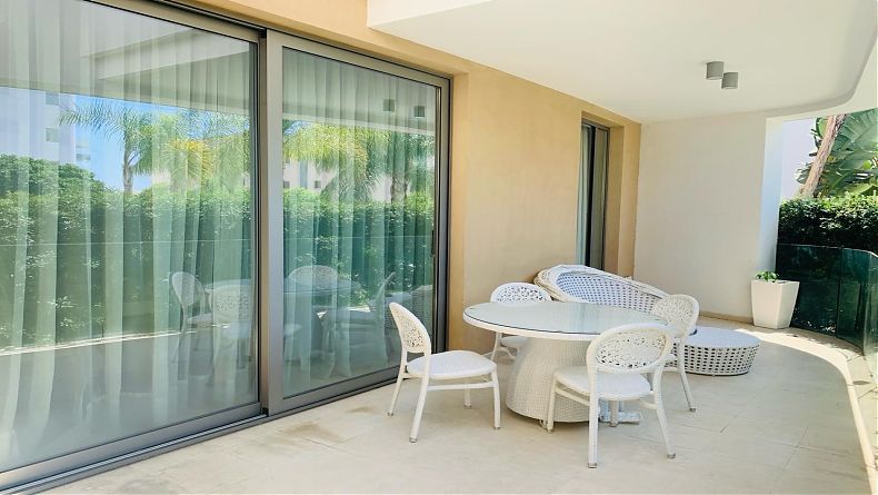 Characteristics: ground floor, covered area 89 sq.m + covered veranda 18 sq.m, living room with a dining room, 2 bedrooms, an open kitchen with household appliances, 2 bathrooms with showers. Veranda with swimming pool view.