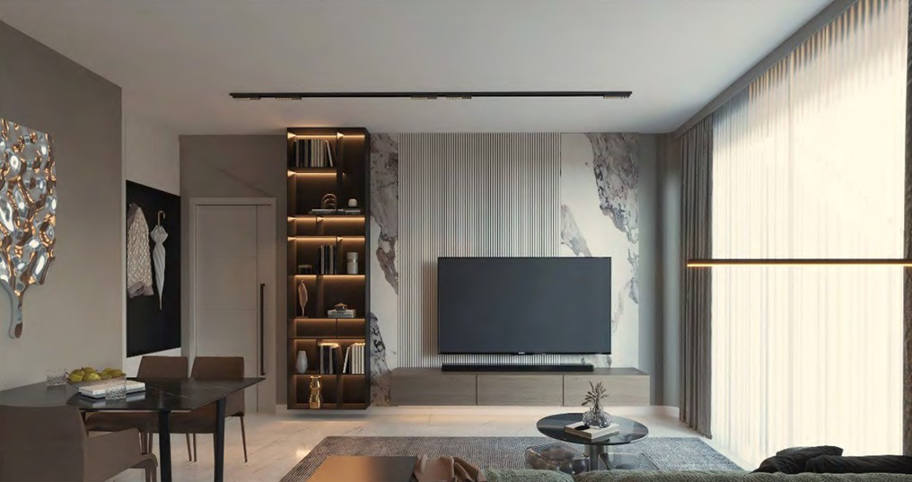 High ceilings, concealed LED lighting, and ceiling-mounted A/C units enhance the sense of space and luxury, while practical details ensure daily convenience and comfort.