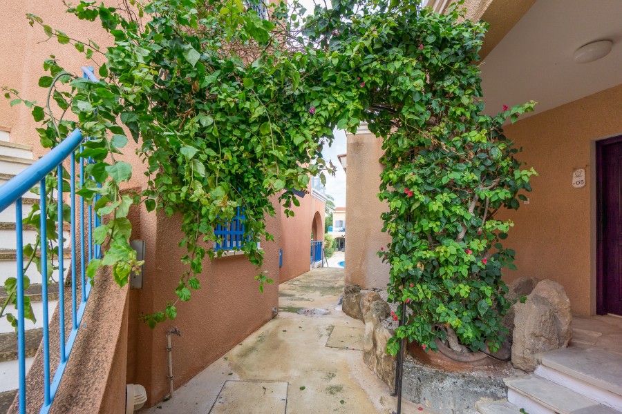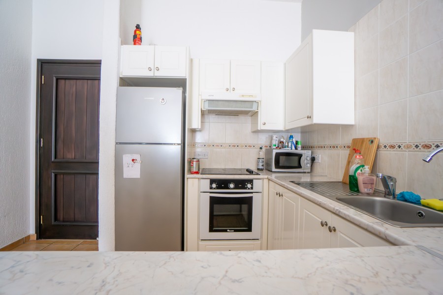 This gorgeous St.George Hills Complex is located in the Chloraka area, with communal landscaped gardens, swimming pool, within walking distance to the unique beaches of St. George Hotel. The complex is also on the main bus route from the harbor to Coral Bay. This two-bedroom apartment is situated on the first floor. The property is accessed via the staircase. The open-plan living areas comprise a lounge, dining area, and kitchen. The kitchen is fitted with a range of wall-mounted and base units, an oven with a hob above, a washing machine, and a tall standing fridge freezer. The kitchen is partially separated from the dining area by a breakfast bar. The living/dining area and has patio doors leading to the spacious veranda enjoying garden & swimming pool views. A hallway gives access to the two bedrooms and the bathroom.