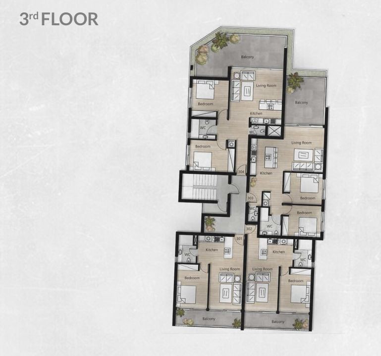 Building A: 4 floors. Two apartments per floor + penthouse. All apartments have 2 bedrooms + living room. Total of 7 apartments.