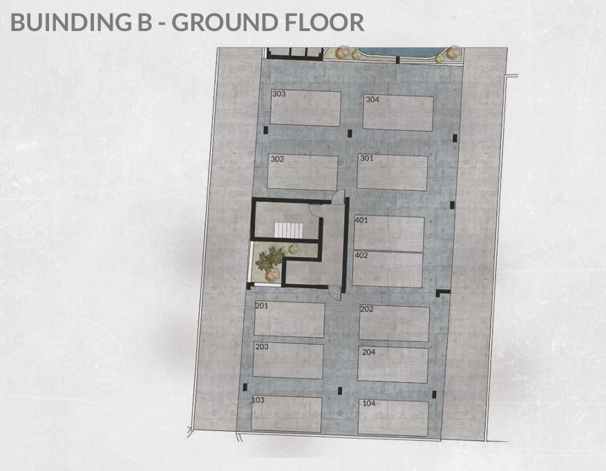 Building B: 4 floors. 4 apartments per floor + 2 penthouses, each with a private jacuzzi. 6 one-bedroom + living room apartments. 6 two-bedroom + living room apartments.