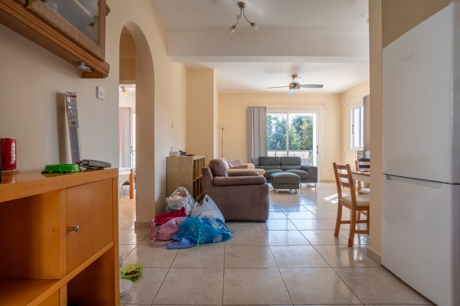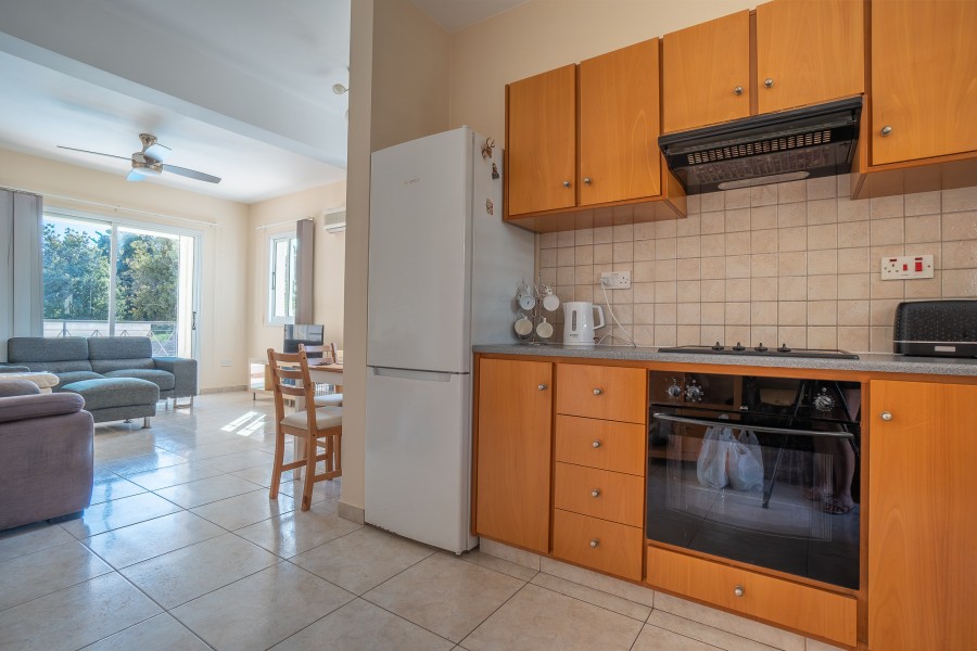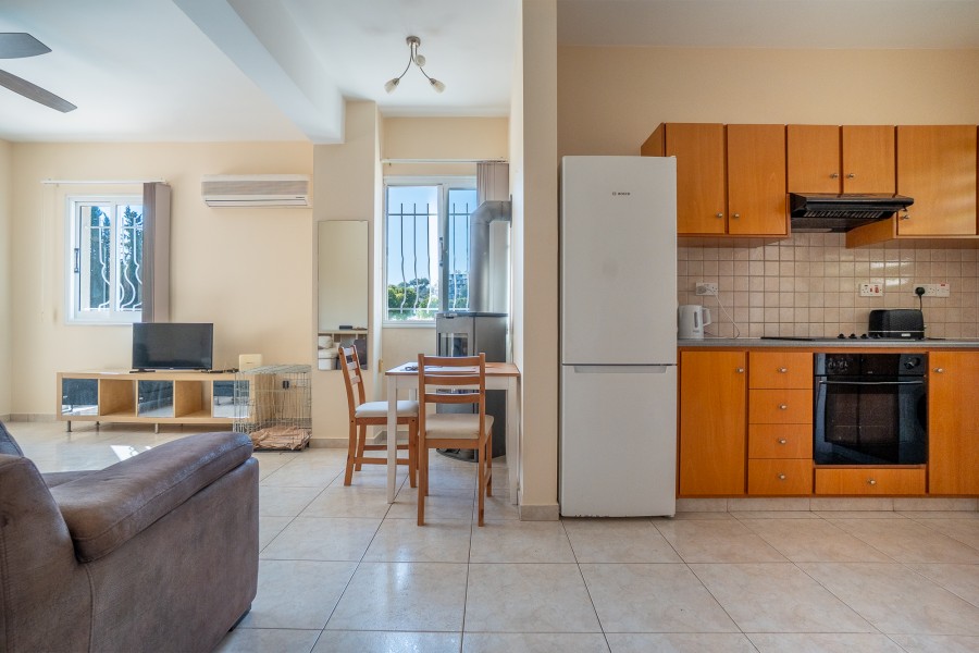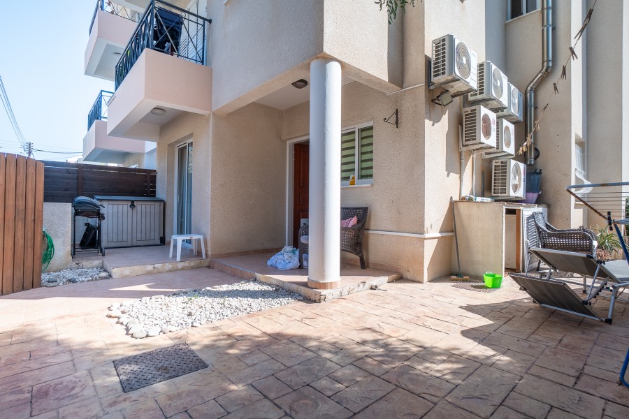 Discover this delightful ground-floor apartment in the heart of Universal, Kato Paphos, offering the perfect mix of comfort, style, and convenience. The property features a bright and airy open-plan living and dining area, flowing through large sliding doors to a generous covered veranda where you can relax and enjoy tranquil views of the communal gardens and swimming pool. Two well-proportioned bedrooms provide restful retreats, complemented by a modern, shared bathroom and built-in wardrobes for practical storage. The kitchen is both sleek and functional, designed to make everyday living easy and enjoyable. Outside, residents benefit from a beautifully maintained communal pool and uncovered parking. Ideally located within walking distance to the beach, seafront promenade, shops, and restaurants, this apartment is an ideal choice for a holiday home, permanent residence, or a smart investment. Title deeds are available for a smooth and secure purchase.