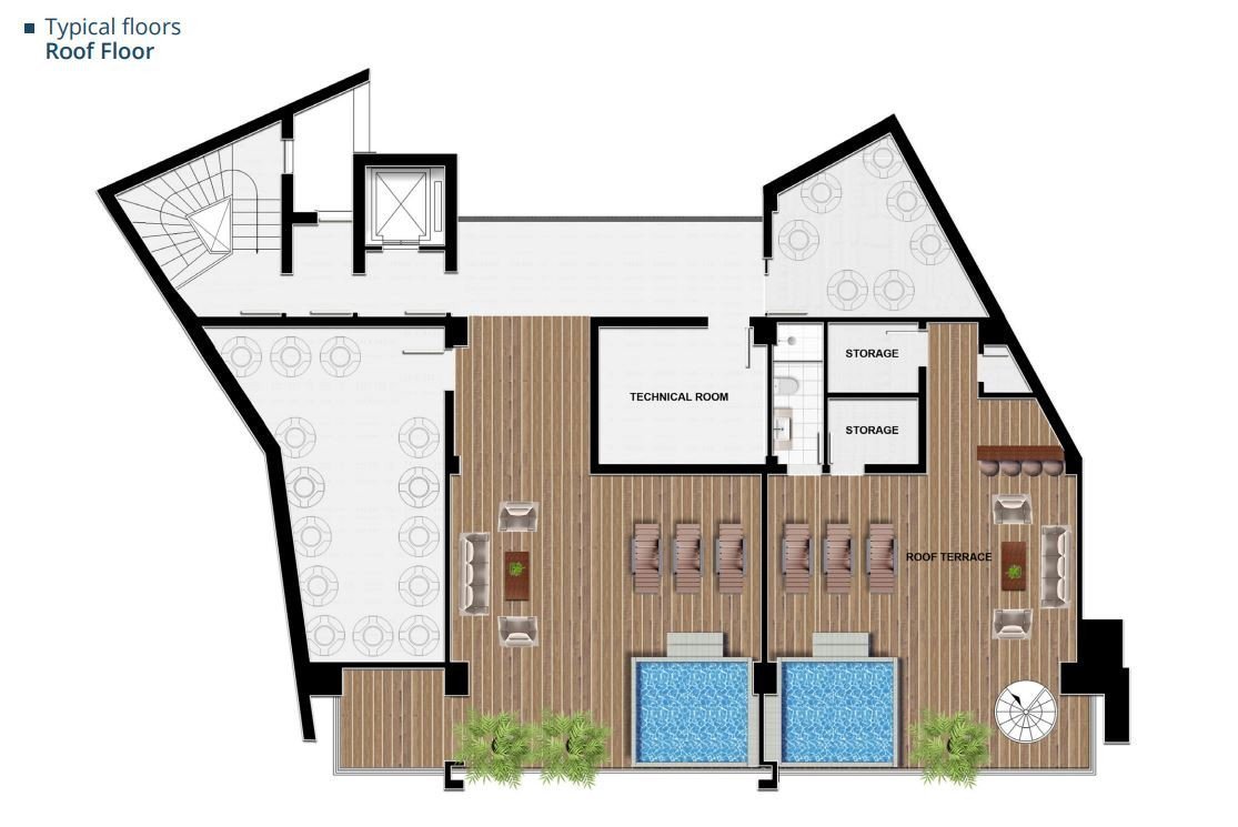 The two bedroom apartments consist of an open space living room and kitchen: 2 bedrooms and 2 bathrooms and a balcony and roof top terraces for the penthouse.