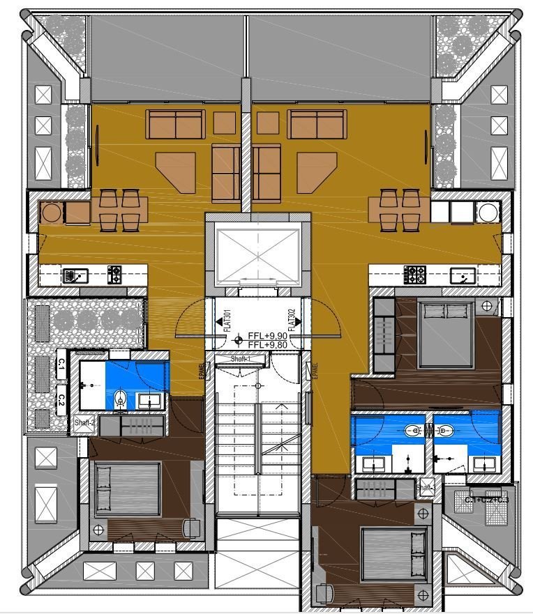 The building consists of 10 apartments ( 5 X 1-bedroom, 3 X 2-Bedrooms, 2 X 3-bedrooms)