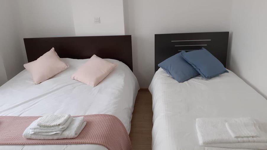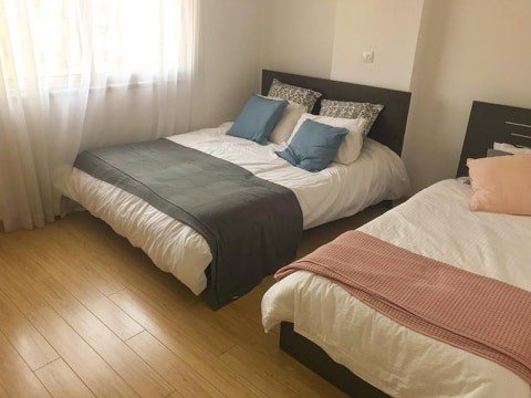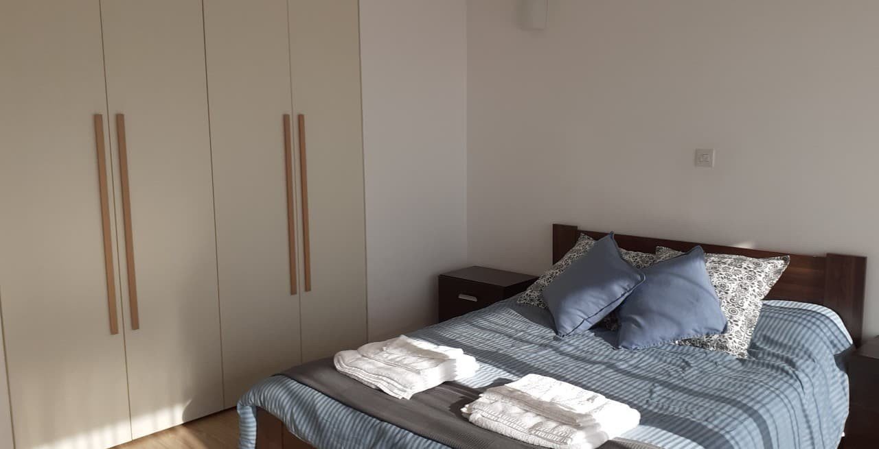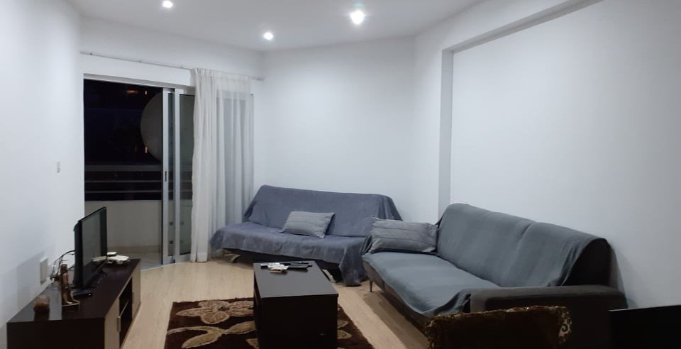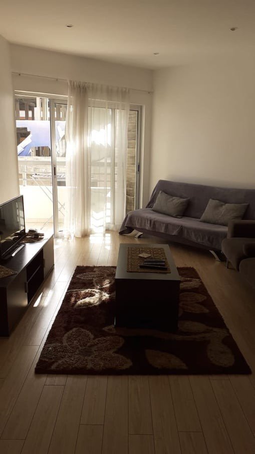The apartment is on the fourth floor and has a total covered area of 112 sqm. Furthermore, the flat comes fully furnished with all kitchen appliances included, and it features 2 large bedrooms, 2 bathrooms, air conditioning in all rooms, duplex windows, one uncovered parking place, one covered veranda with sea view, a big common swimming pool on the rooftop with a wonderful sea view, there is a Gym in the building with all the fitness equipment, a big reception at the entrance of the building and CCTV operation.