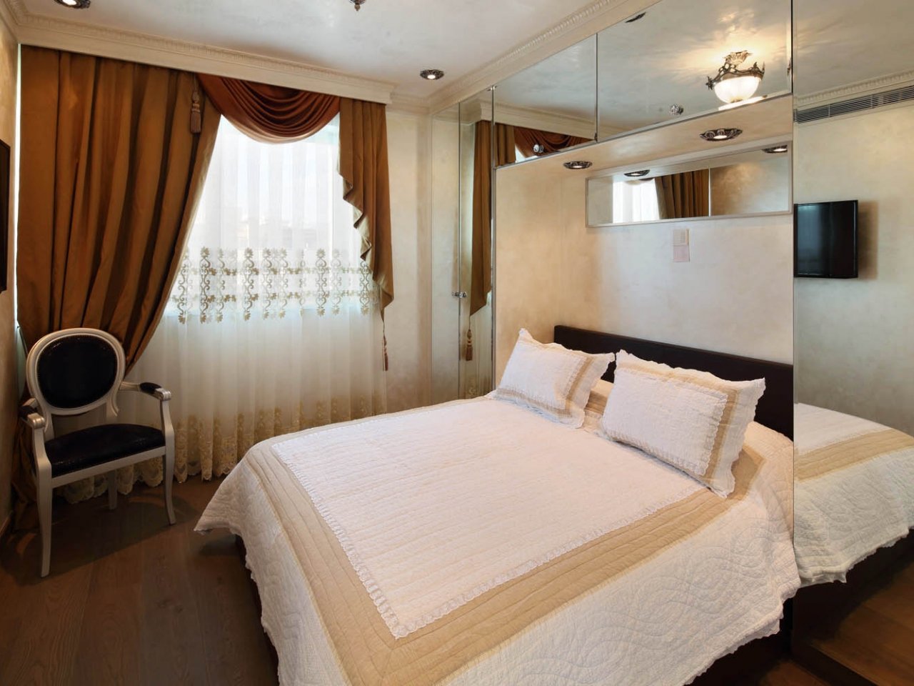 Curtains from high-quality Italian fabric and electrically operated with black-out system.