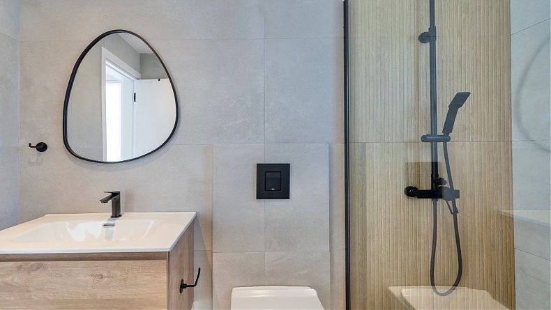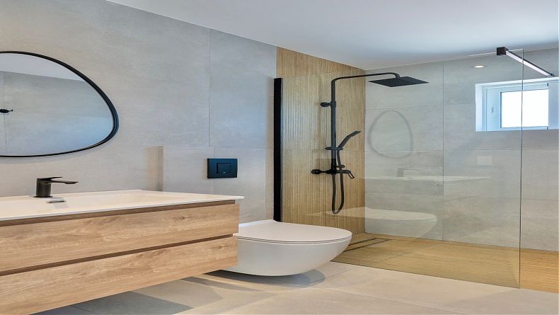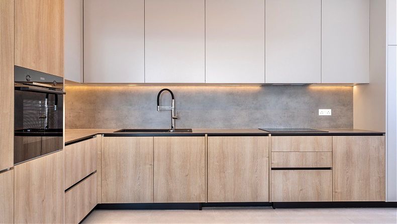 Fully equipped kitchen equipped with Bosch concealed appliances, including a fridge freezer, washing machine, oven, and dishwasher, while a solar panel system and water pressure system enhance efficiency.