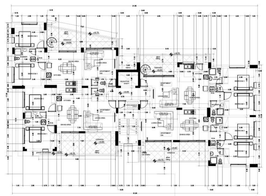 The block contains 12 luxury apartments, each floor are 4 apartments with 2 beds and 2 bathrooms