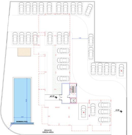 On the ground level you will find the covered parking space of the apartments, the large swimming pool and the landscaped gardens.