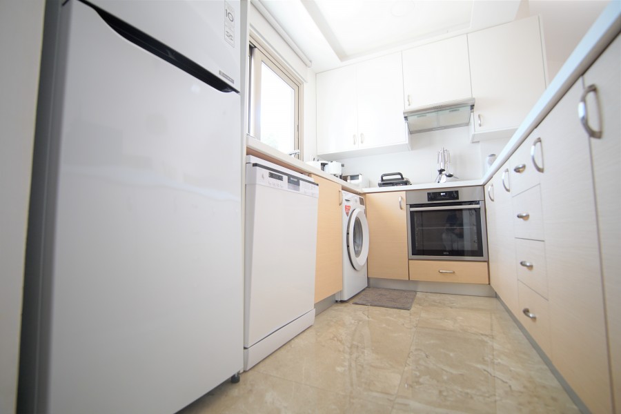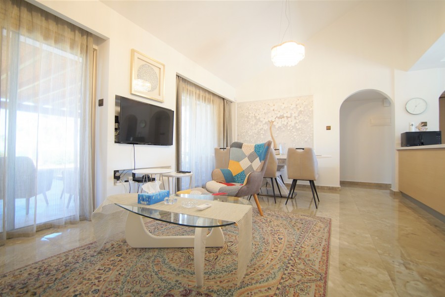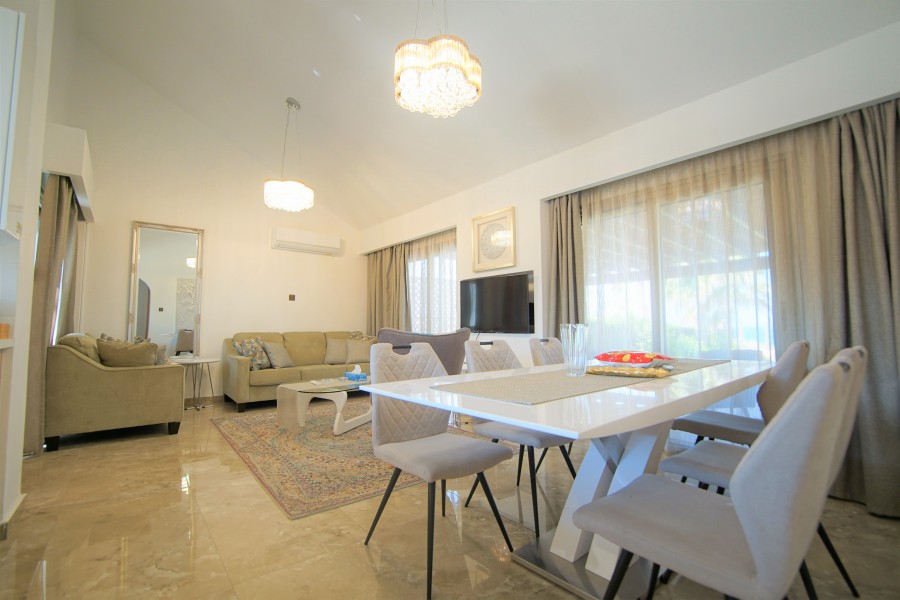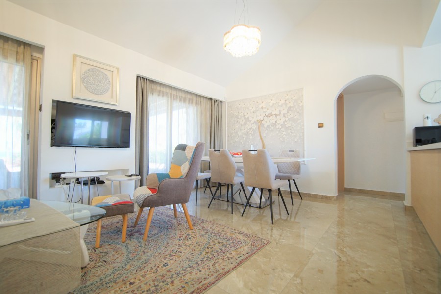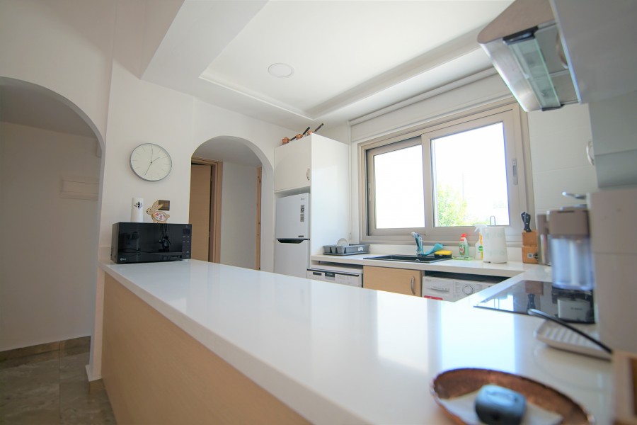 The main entrance of the bungalow leads to an open plan living/dining area with a fitted kitchen and then onwards to two good size bedrooms with fitted wardrobes and a family bathroom. The property is fully furnished with air conditioning, and a washing machine and all white goods are included as well. Easy access through the patio doors leads to a backyard with a view to the Mediterranean Sea. In addition, a delightful garden, and parking space.