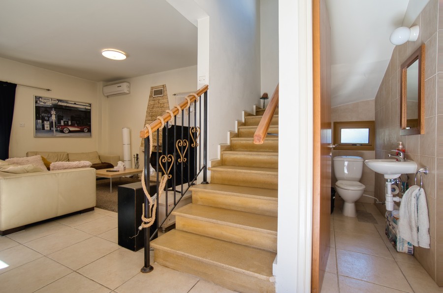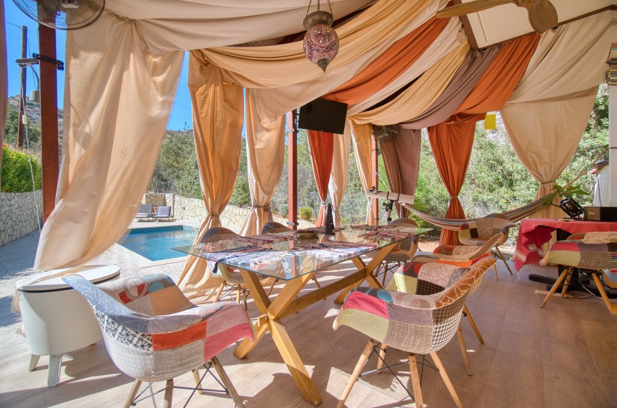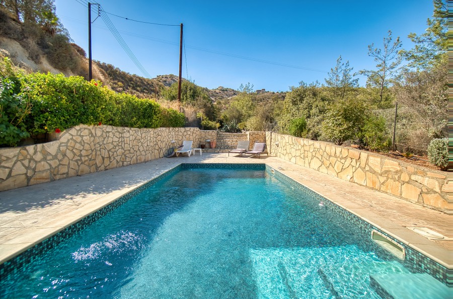 Discover this beautiful detached 2-bedroom villa with a private pool, nestled in the tranquil area of Akrounta, just a 10-minute drive from Limassol's city center. Each bedroom features its ensuite bathroom and a private balcony. One bedroom offers serene views of the Germasogeia Dam and the surrounding hills, while the other opens to a balcony overlooking the inviting swimming pool. The ground floor boasts a spacious living room with a fireplace, complemented by a well-sized separate kitchen with ample space for a dining table. For sustainability and cost-efficiency, eco-friendly solar panels for electricity are installed. Experience the full joys of outdoor living with a 20m² open veranda at the front, along with a perfectly positioned 30m² covered veranda at the rear, right next to the alluring pool. This exclusive property- ideal haven for those who appreciate the outdoors and the beauty of nature.