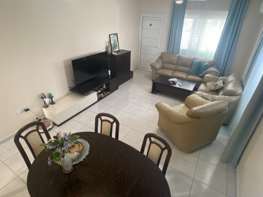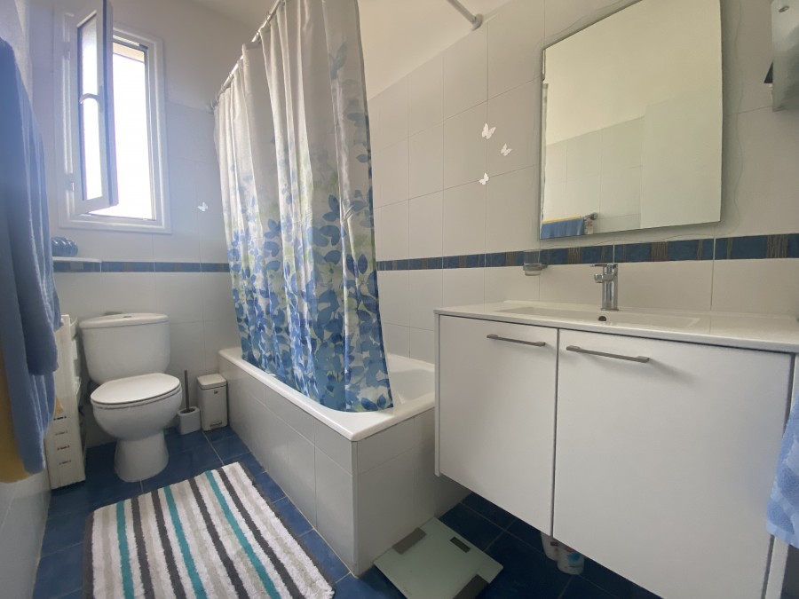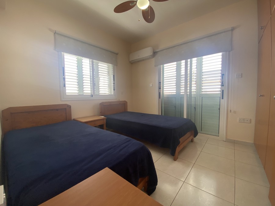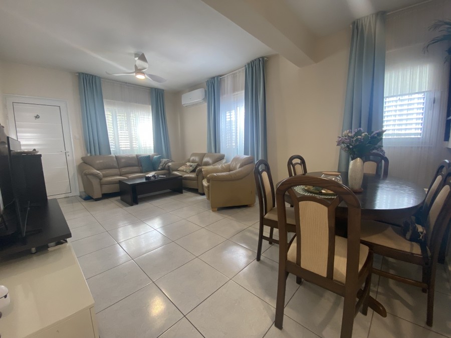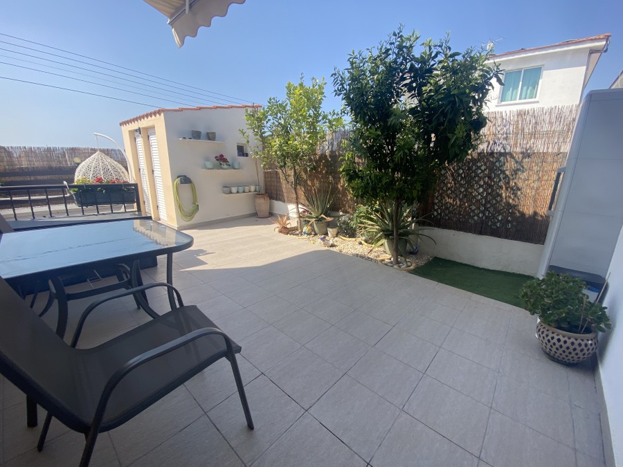 Inside, the home features new air conditioning units throughout, ensuring year-round comfort, while shutters add both style and security. The layout includes a spacious open-plan living area, a guest toilet, and two well-sized bedrooms. Additional benefits include private allocated parking and extra storage space.