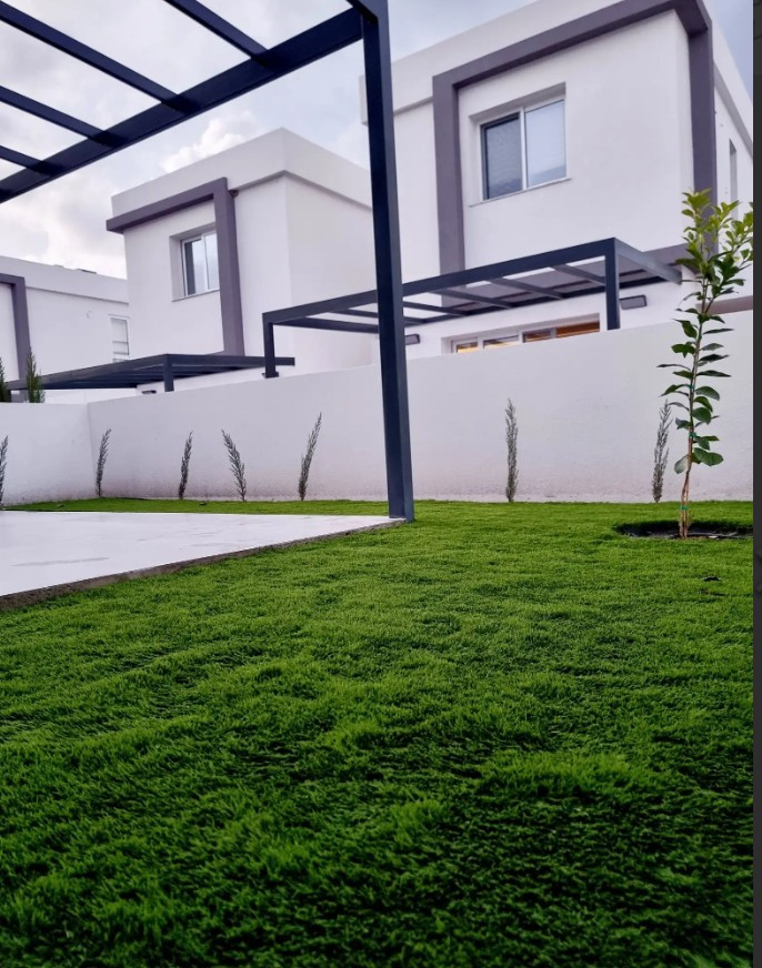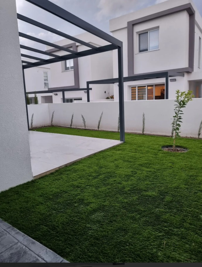 Private garden with artificial grass, freshly planted trees, pergola, and an external storeroom