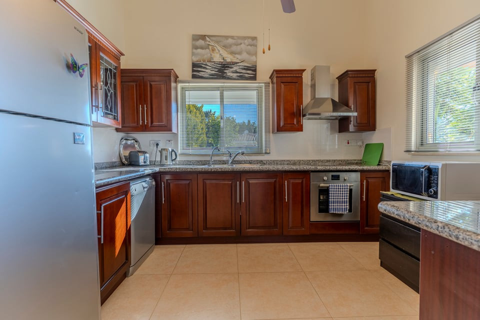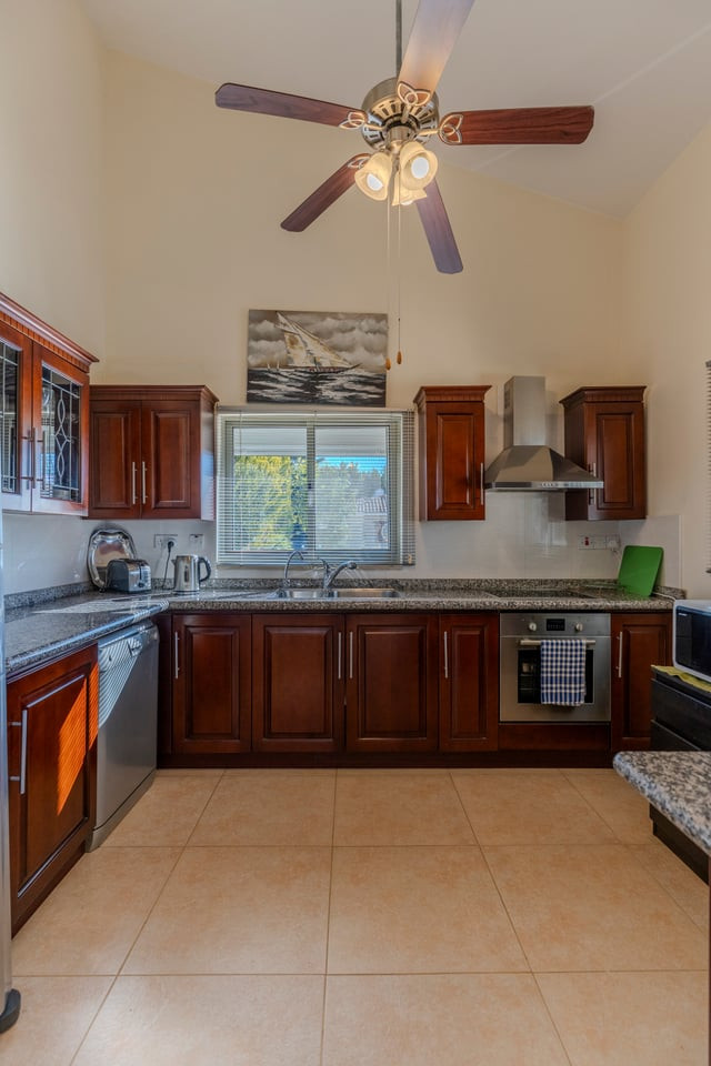 The property features a bright and spacious open-plan living and dining area, enhanced by patio doors that open directly onto the pool and landscaped garden. A semi-separate, fully fitted and equipped kitchen offers both practicality and generous workspace.