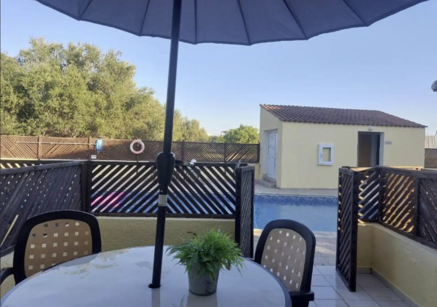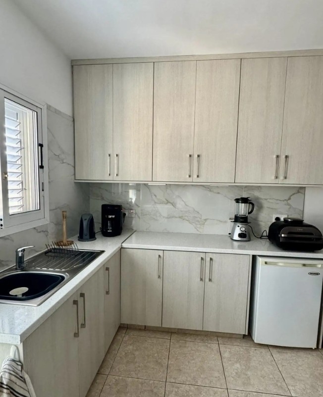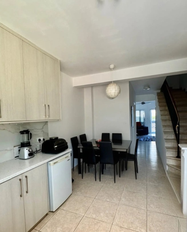 This charming two-bedroom townhouse is located in a peaceful cul-de-sac in Chloraka, making it an ideal home for families. Conveniently situated just minutes away from supermarkets, banks, schools, nurseries, and other essential amenities, this property offers both comfort and convenience. The development features a communal swimming pool complete with showers, toilets, sunbeds, and umbrellas, perfect for relaxation and leisure. The property itself is fully enclosed, with a front veranda and small garden as well as a rear veranda for added outdoor space. Upon entering through the front door, you’ll find a welcoming living area that flows seamlessly into the kitchen and dining area. The ground floor also includes a guest cloakroom with shower and a storage cupboard under the stairs for practicality. Upstairs, there are two spacious bedrooms, each with fitted wardrobes, additional storage, and private balconies. These bedrooms share a well-appointed family bathroom featuring a shower screen and vanity unit.