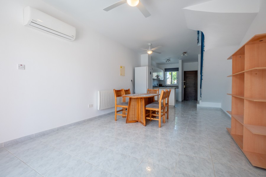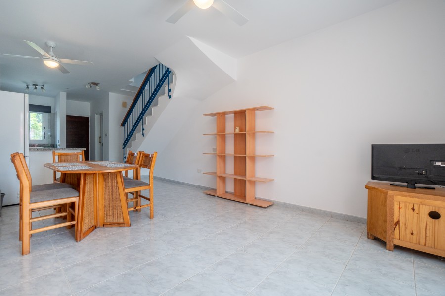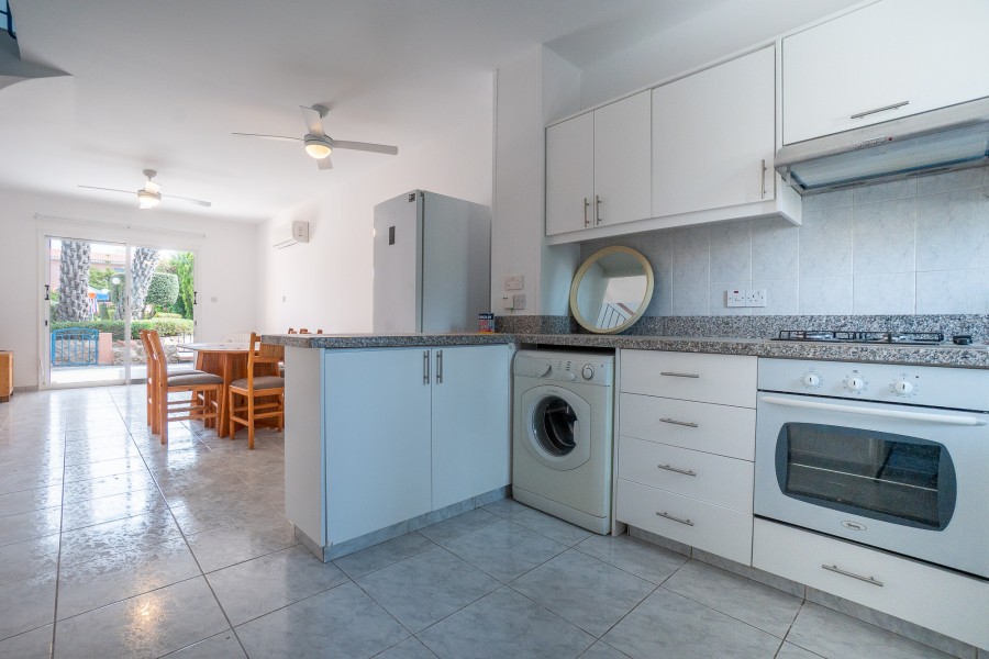 Inside, the home features two generously sized bedrooms with built-in wardrobes, a family bathroom, and a guest toilet on the ground floor. The spacious open-plan living and dining area flows effortlessly onto a private terrace that overlooks the communal pool—perfect for outdoor dining or a peaceful morning coffee. Fully air-conditioned throughout, the home offers comfort in every season.
