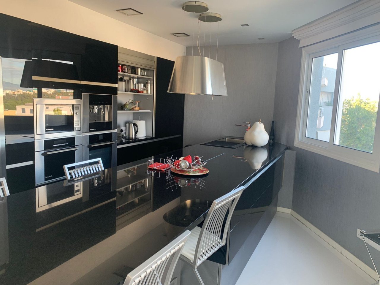 Very high-quality fitted kitchen appliances including: Microwave, Coffeemaker with integrated coffee bean grinder, 1x standard oven, 1x steam oven, combination fridge & freezer units