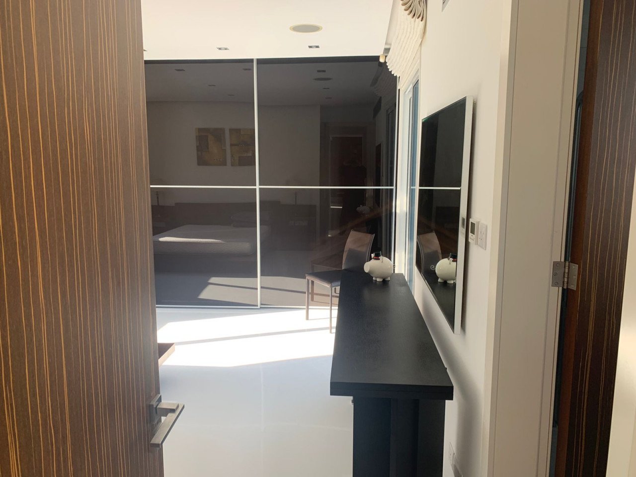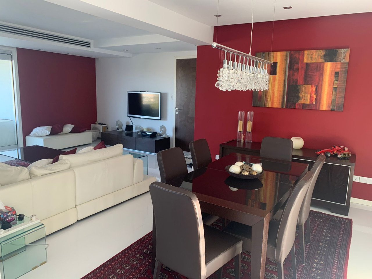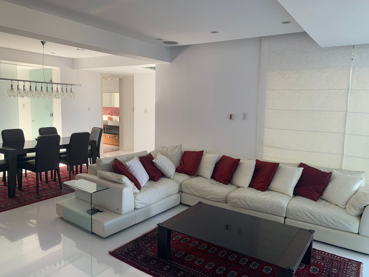 The apartment has a smart-home design, and as you enter, you will find a spacious living room with a big dining area that connects to the balcony. As you continue, you will find a separate kitchen with an island with access to the balcony. Moving on, you will find a separate large office, the family bathroom, a bedroom, and the master en-suite bedroom. The apartment is equipped with a sound system throughout and white marble flooring with underfloor heating, and it is cooled with a VRV cooling system.