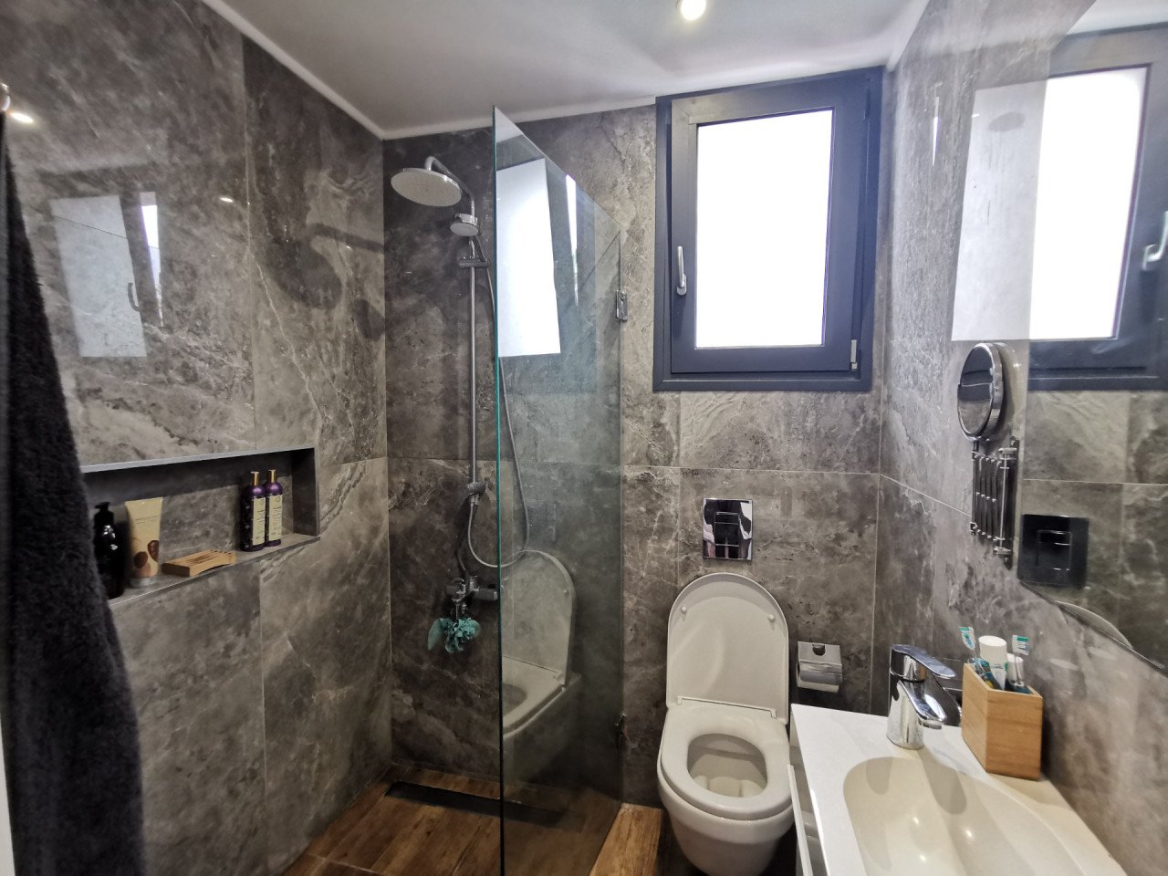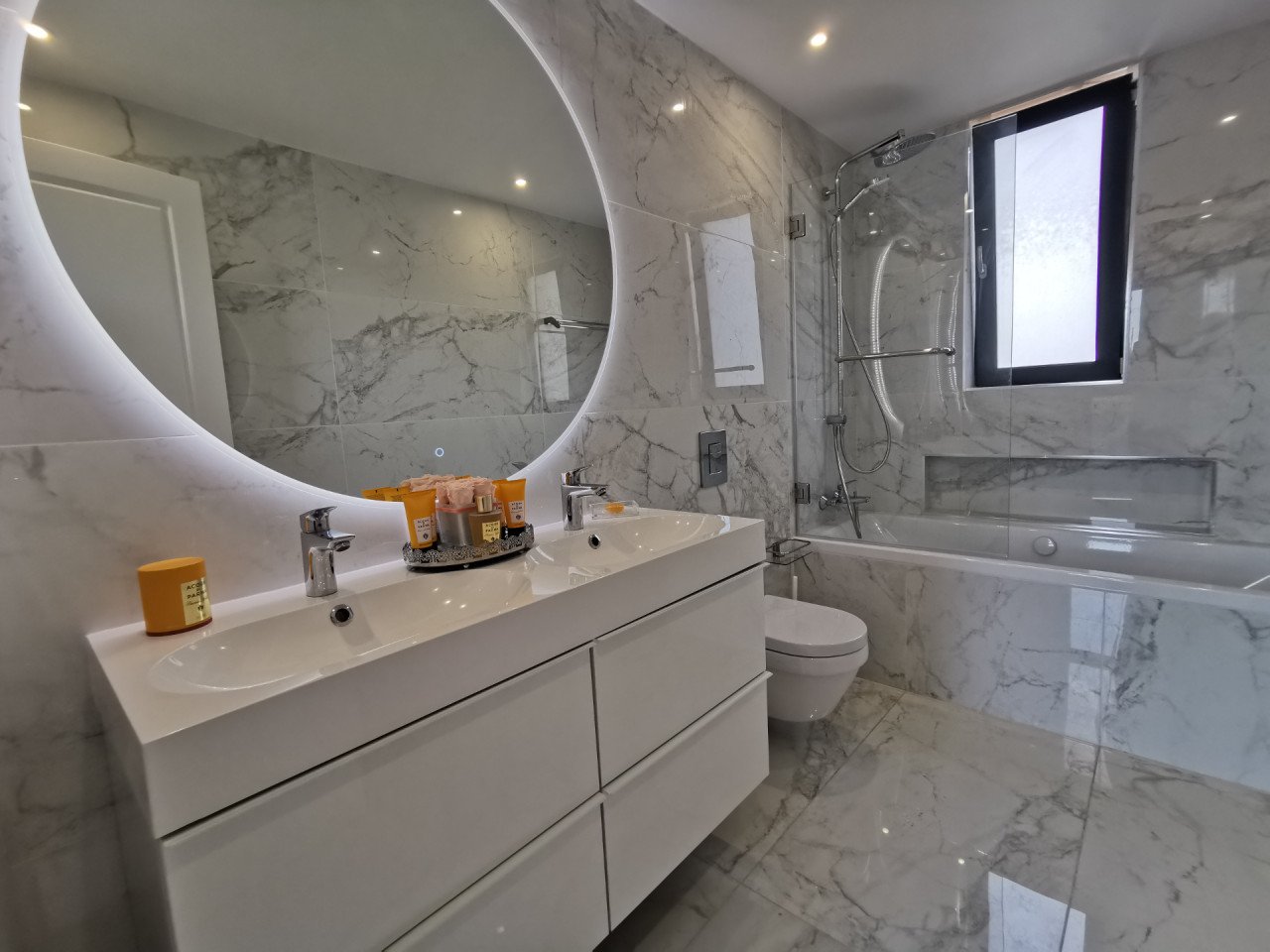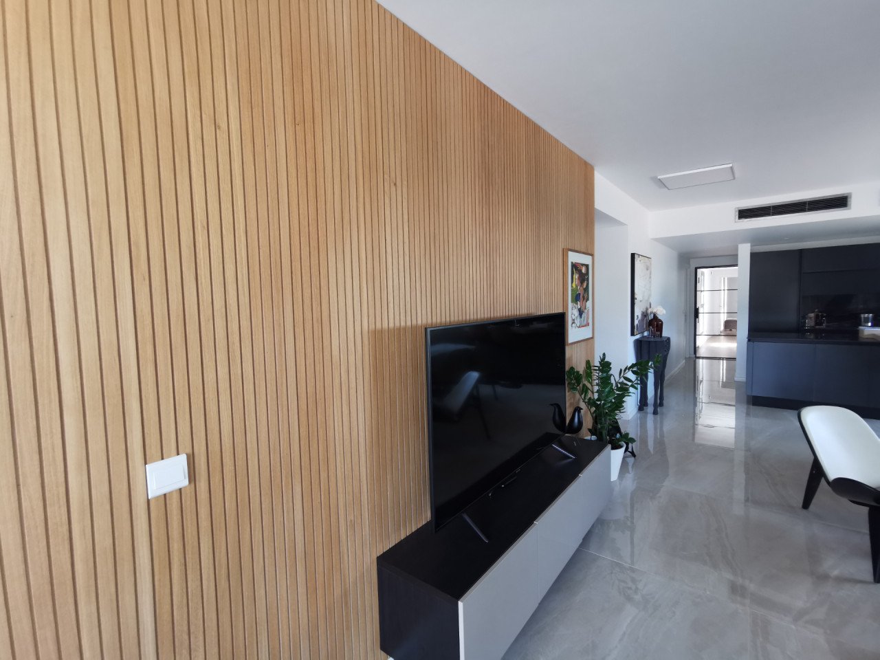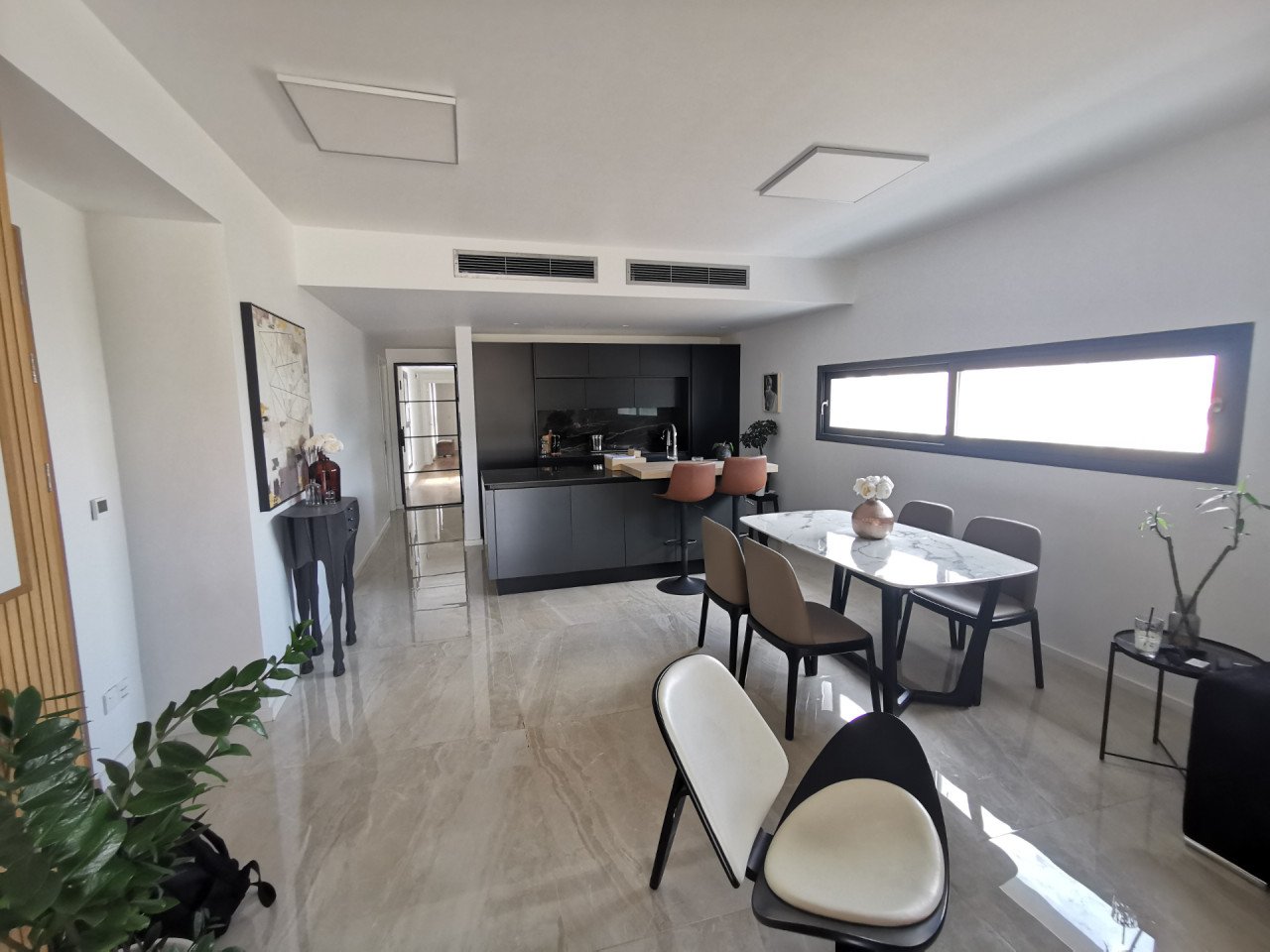 As you enter the apartment, you will find a spacious open plan living room and kitchen with marble flooring and wooden accents, equipped with a kitchen island and a guest bathroom, leading to the large 23sq.m. balcony. As you continue through the glass door to the hallway, you will find the big family bathroom as well as the two spacious bedrooms, and at the end of the hallway, you will find the master en-suite bedroom with its own walk-in wardrobe. The apartment is custom-made with the best materials to enhance convenience and practicality. It also offers underfloor heating throughout the apartment, and it's cooled with a VRV system and a split-unit AC.