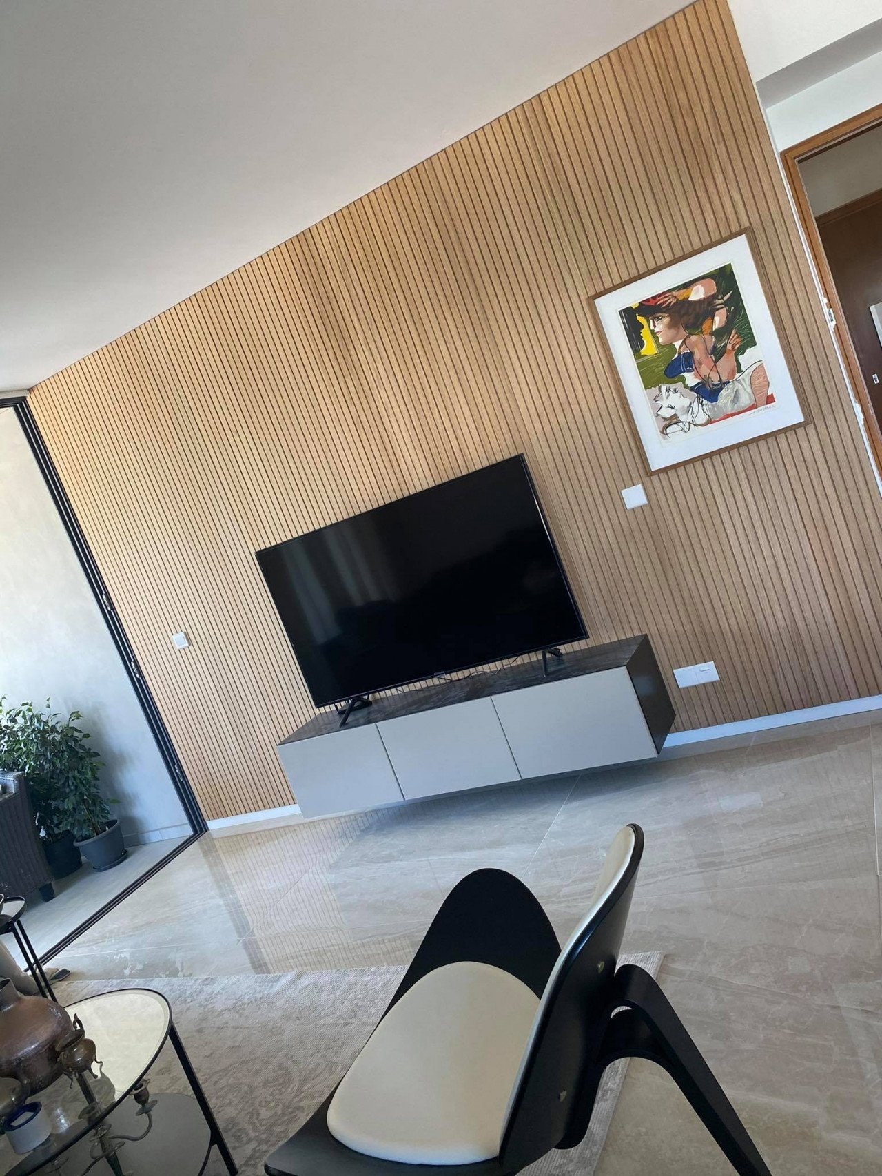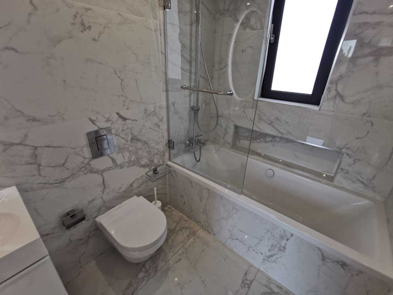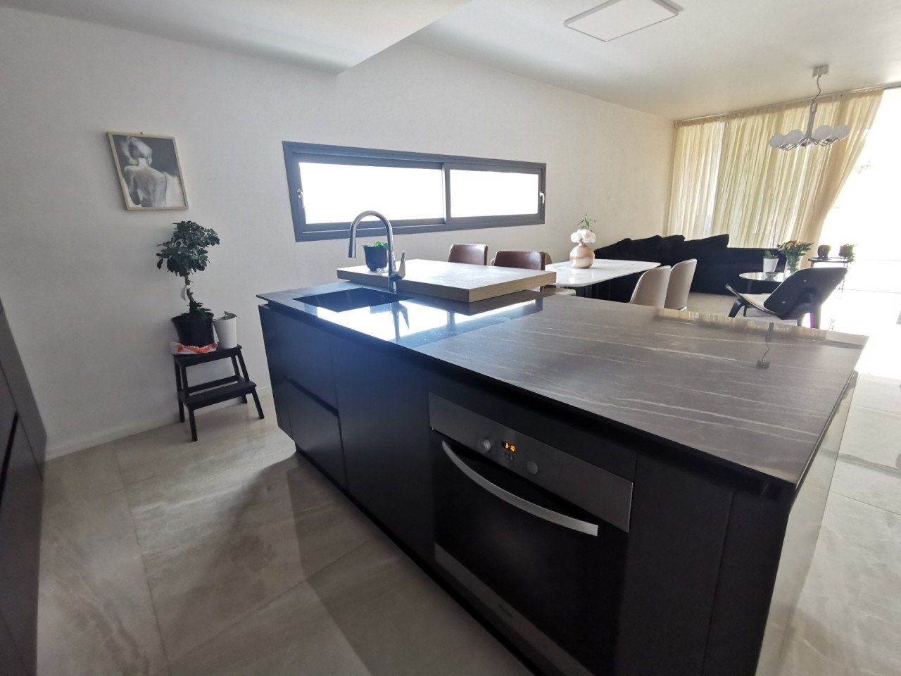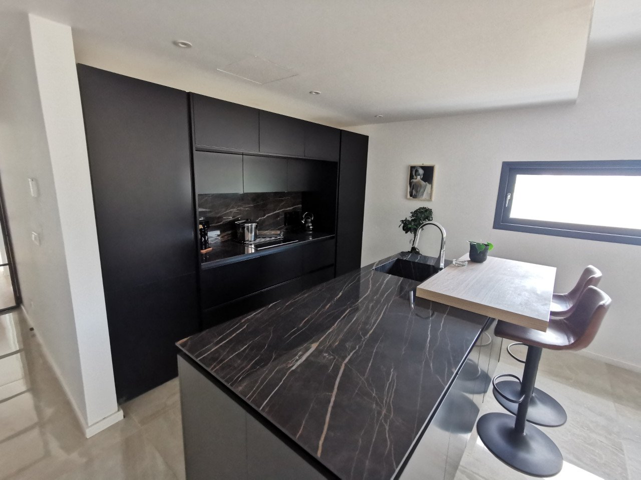 As you enter the apartment, you will find a spacious open plan living room and kitchen with marble flooring and wooden accents, equipped with a kitchen island and a guest bathroom, leading to the large 23sq.m. balcony. As you continue through the glass door to the hallway, you will find the big family bathroom as well as the two spacious bedrooms, and at the end of the hallway, you will find the master en-suite bedroom with its own walk-in wardrobe. The apartment is custom-made with the best materials to enhance convenience and practicality. It also offers underfloor heating throughout the apartment, and it's cooled with a VRV system and a split-unit AC.