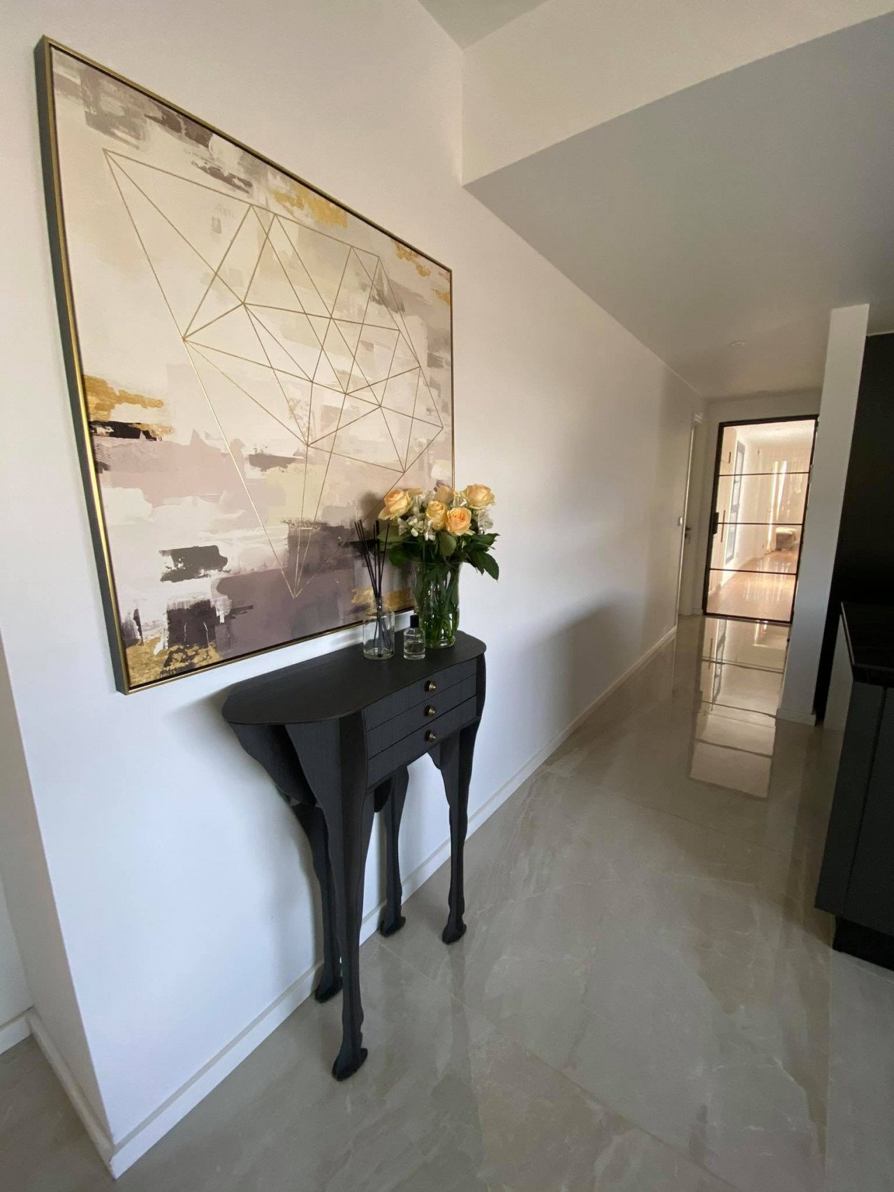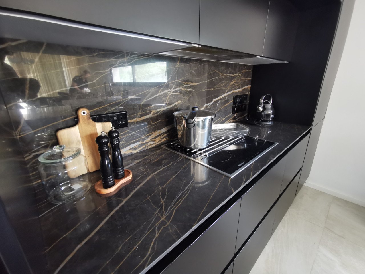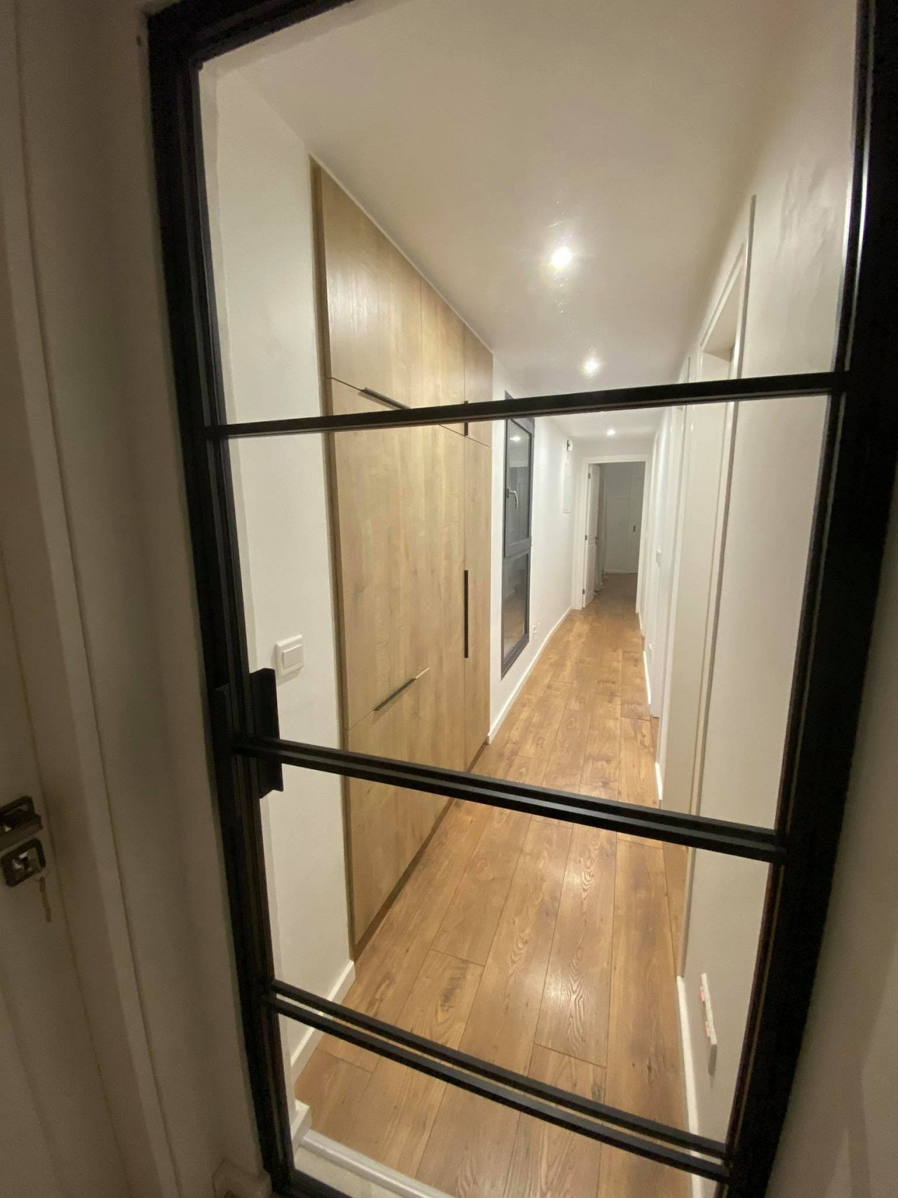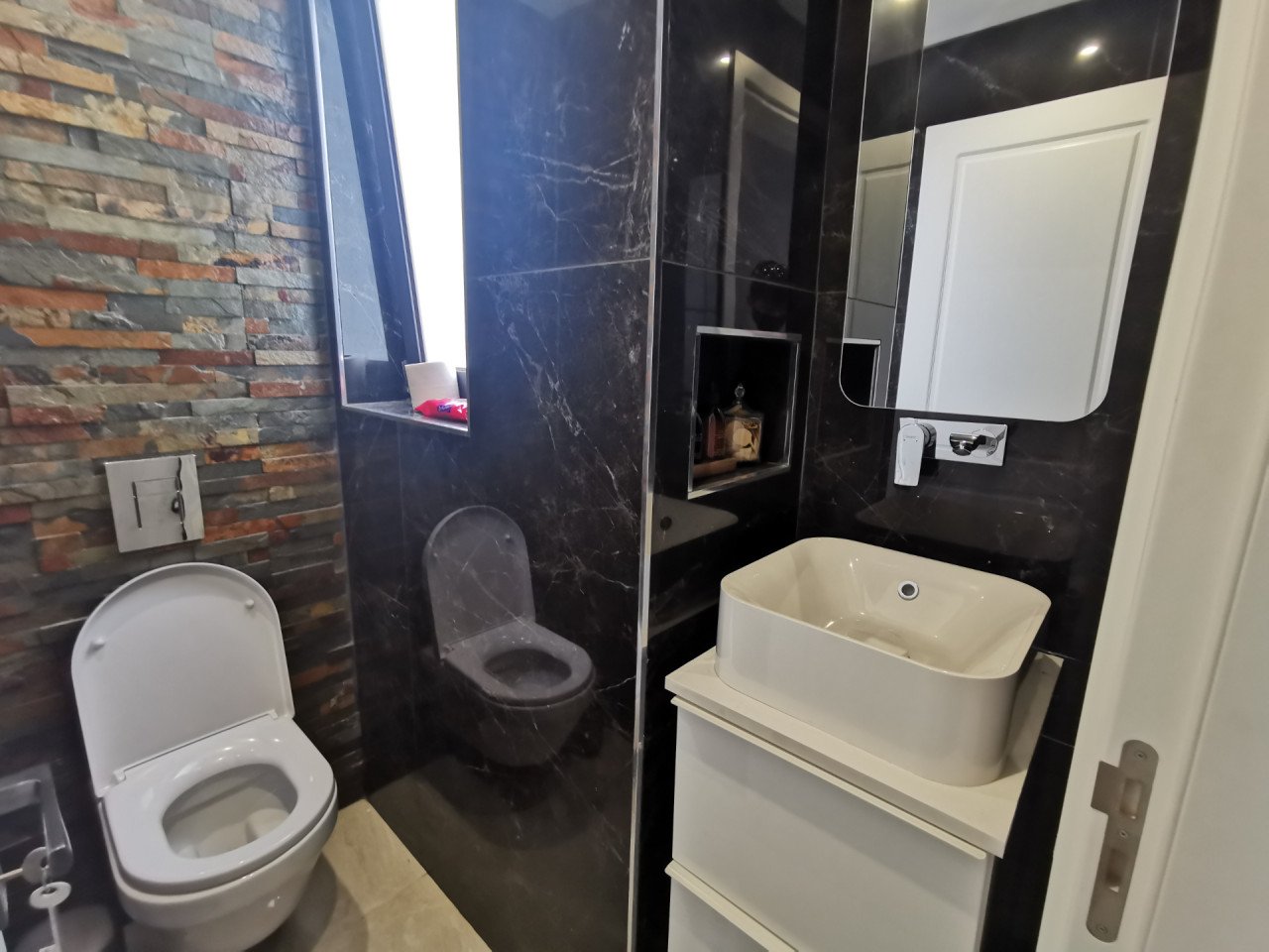 As you enter the apartment, you will find a spacious open plan living room and kitchen with marble flooring and wooden accents, equipped with a kitchen island and a guest bathroom, leading to the large 23sq.m. balcony. As you continue through the glass door to the hallway, you will find the big family bathroom as well as the two spacious bedrooms, and at the end of the hallway, you will find the master en-suite bedroom with its own walk-in wardrobe. The apartment is custom-made with the best materials to enhance convenience and practicality. It also offers underfloor heating throughout the apartment, and it's cooled with a VRV system and a split-unit AC.