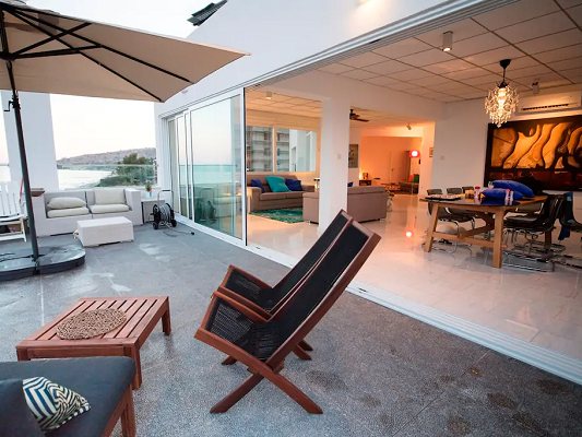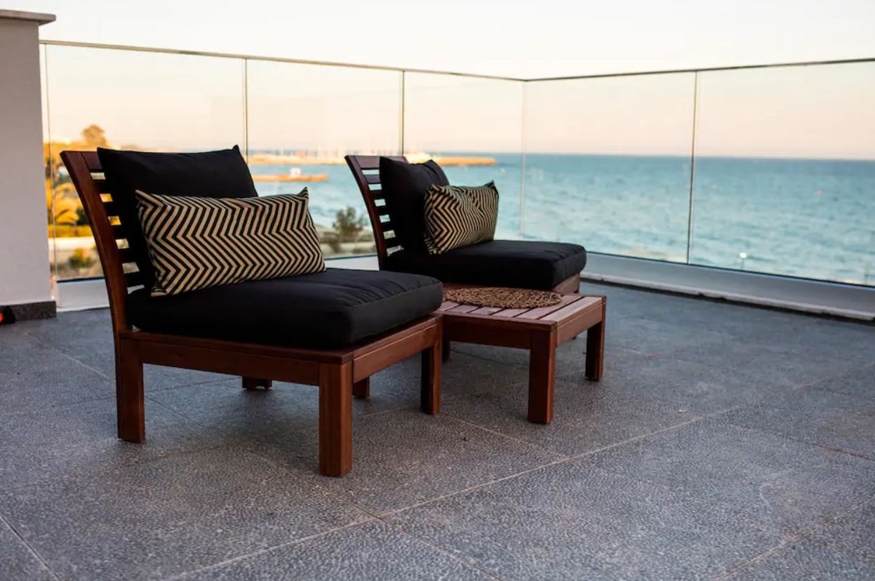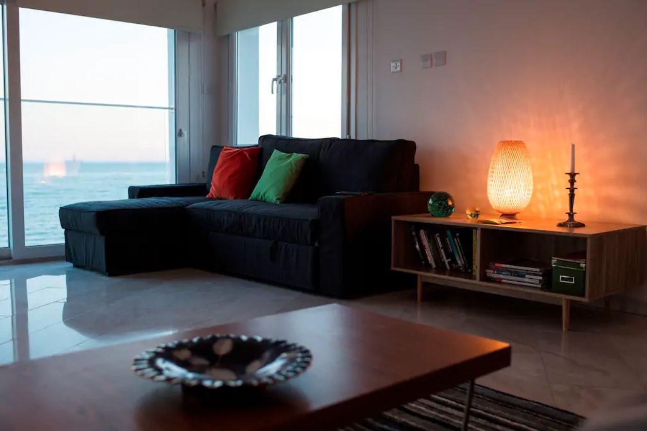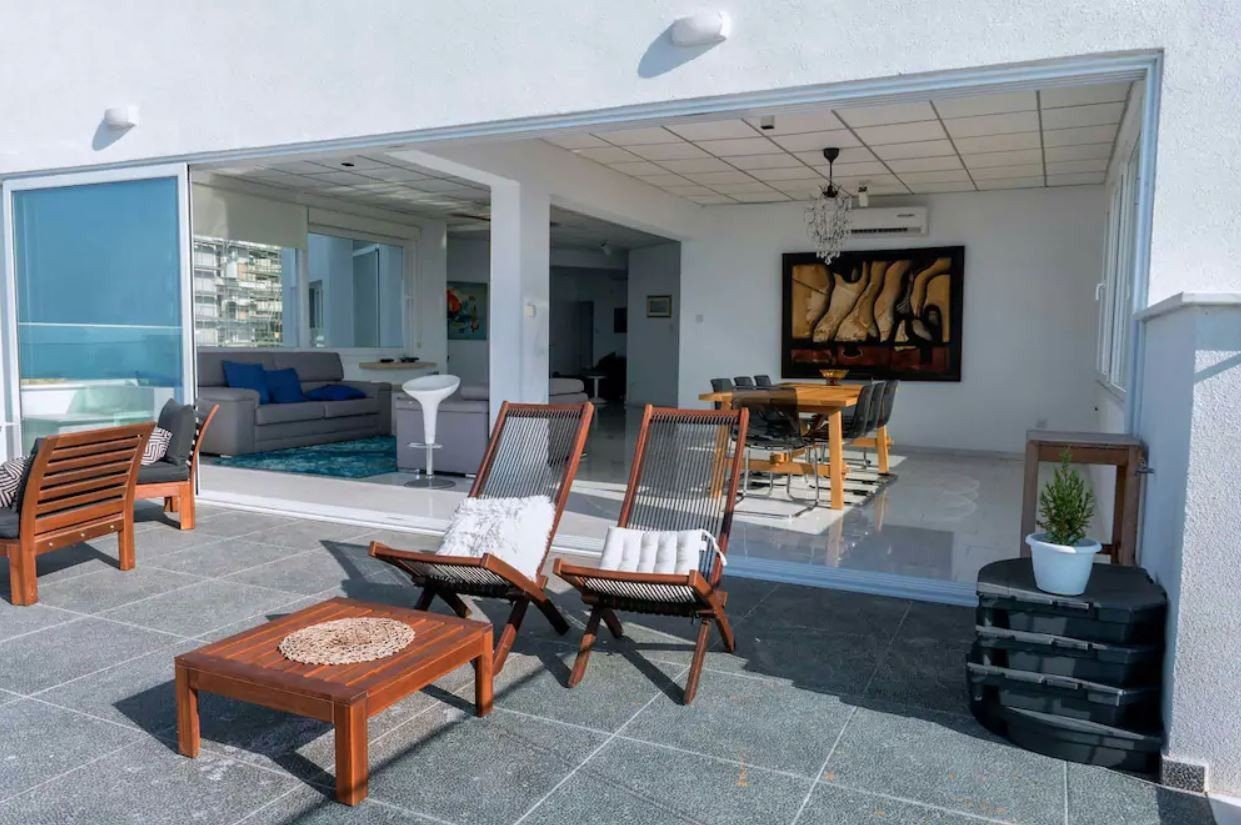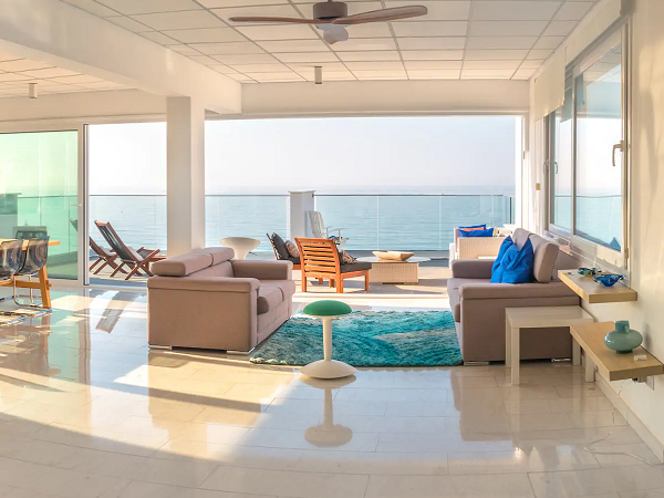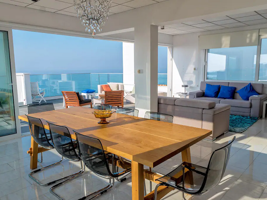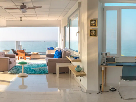 Two double sofa beds are also available in the living room (sleeping masks available to block out morning lights. Coming out of the bedrooms, you enter into a very spacious living room continuing onto an open dining room and ending on a private veranda, all overlooking the Mediterranean Sea.