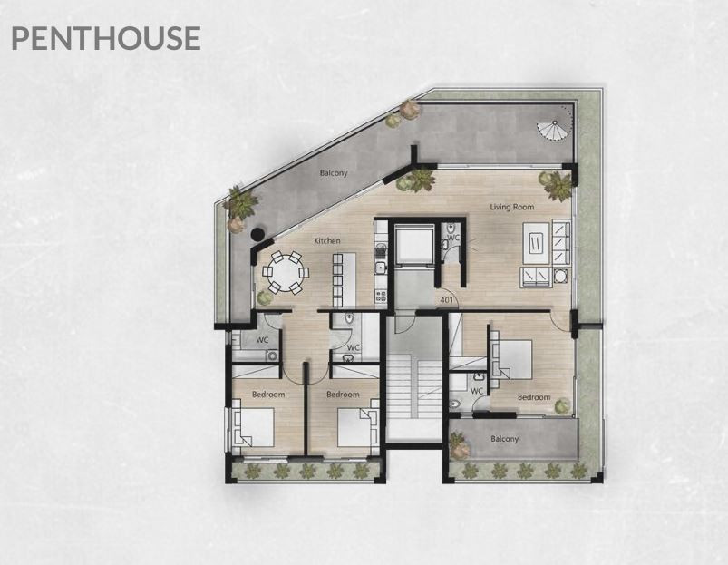 Building A: 4 floors. Two apartments per floor + penthouse. All apartments have 2 bedrooms + living room. Total of 7 apartments.