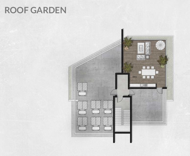 Building B: 4 floors. 4 apartments per floor + 2 penthouses, each with a private jacuzzi. 6 one-bedroom + living room apartments. 6 two-bedroom + living room apartments.