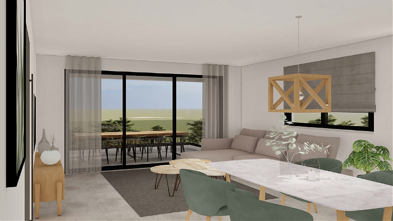 >Open plan lounge/dining room and kitchen with patio doors leading to the covered veranda and private garden