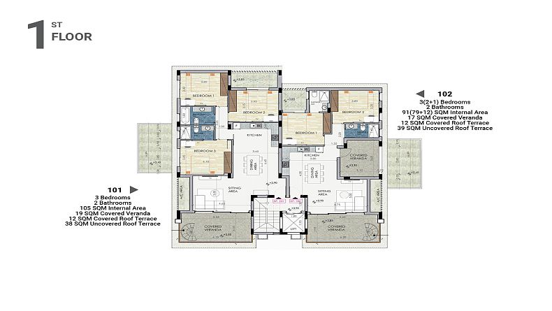 A two storey building with only 4 apartments and the 2 apartments on the 1st floor with roof gardens.
