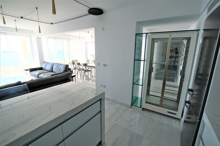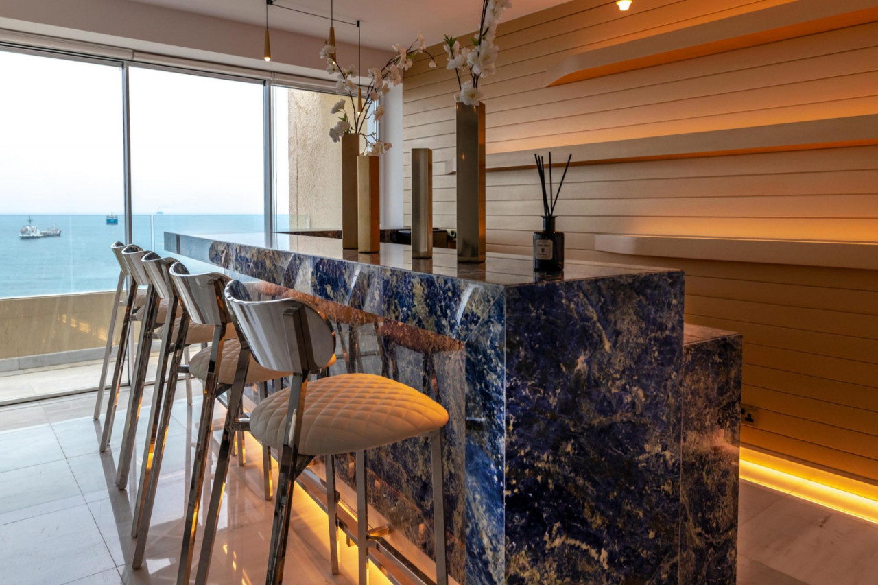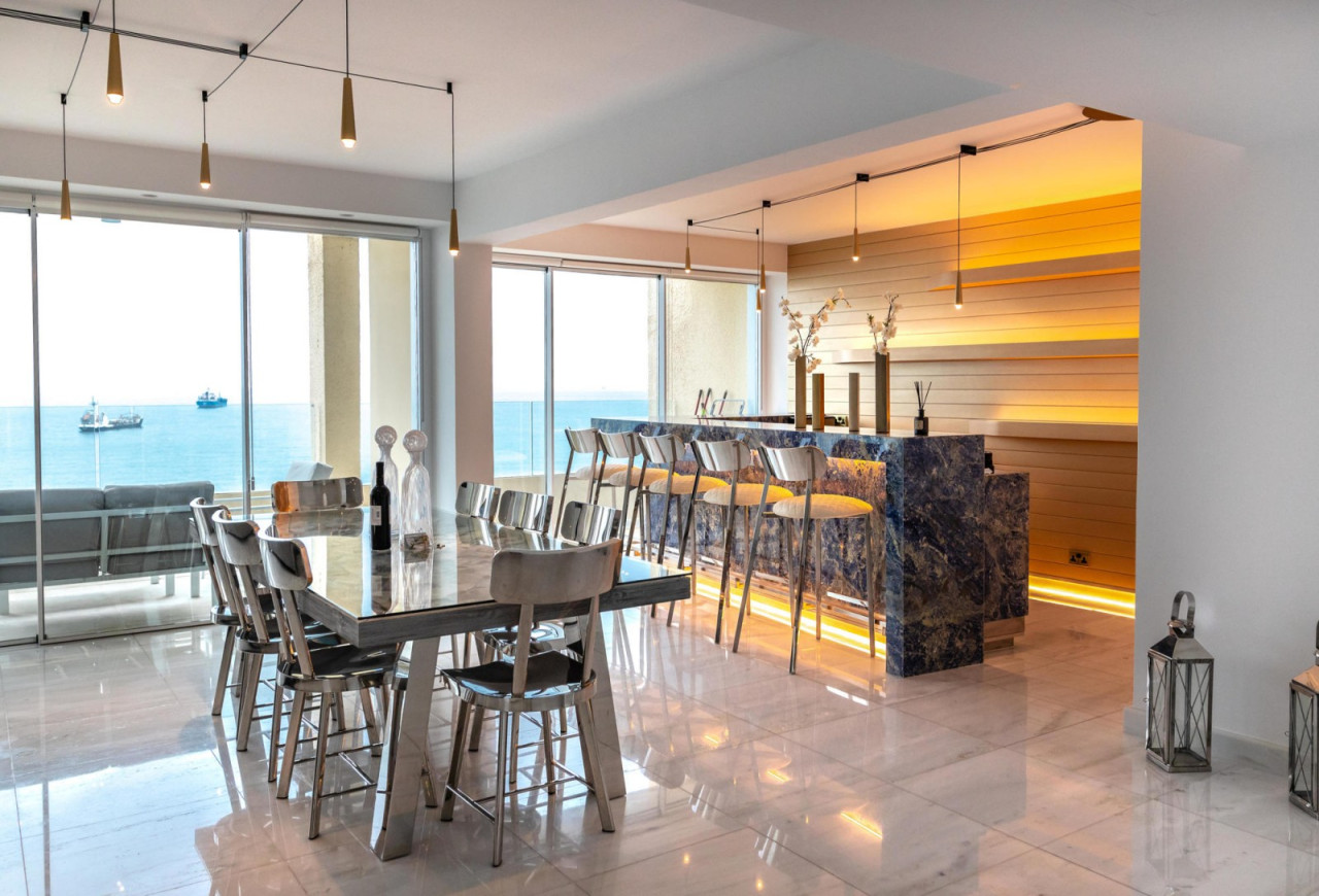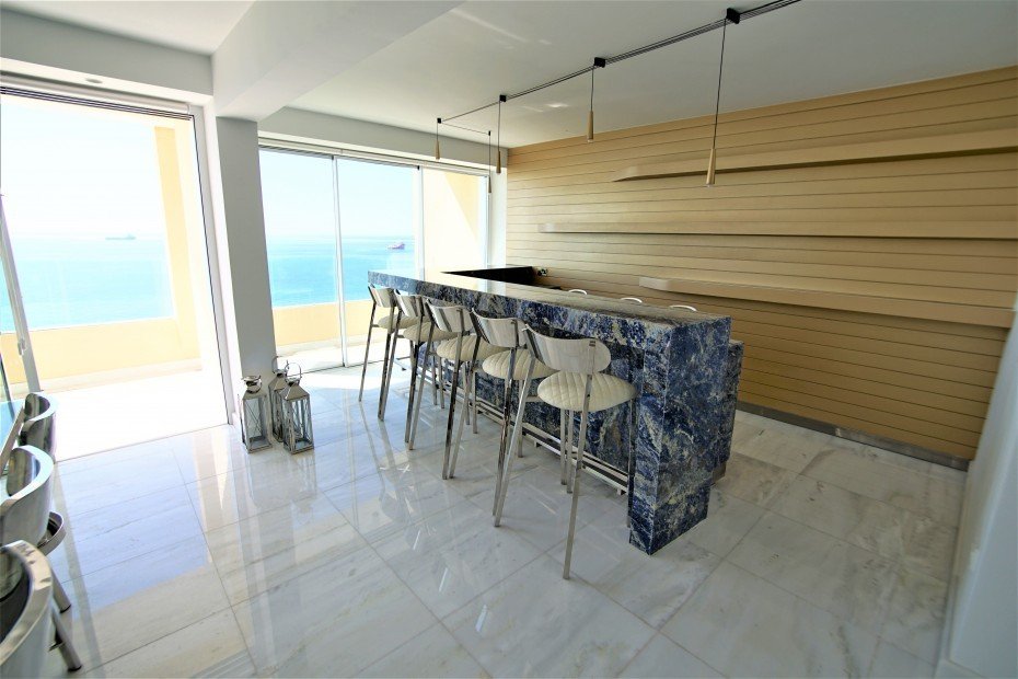 The apartment is on the 7th floor which is the top floor where it offers panoramic views from every corner with its floor to ceiling windows. Offered fully furnished to the highest standards. It consists of 3 bedrooms all with their own en suites and storage, a huge open plan space which consists of a fully equipped kitchen with Miele appliances, living area, dining area, bar and private covered balcony right opposite the sea.