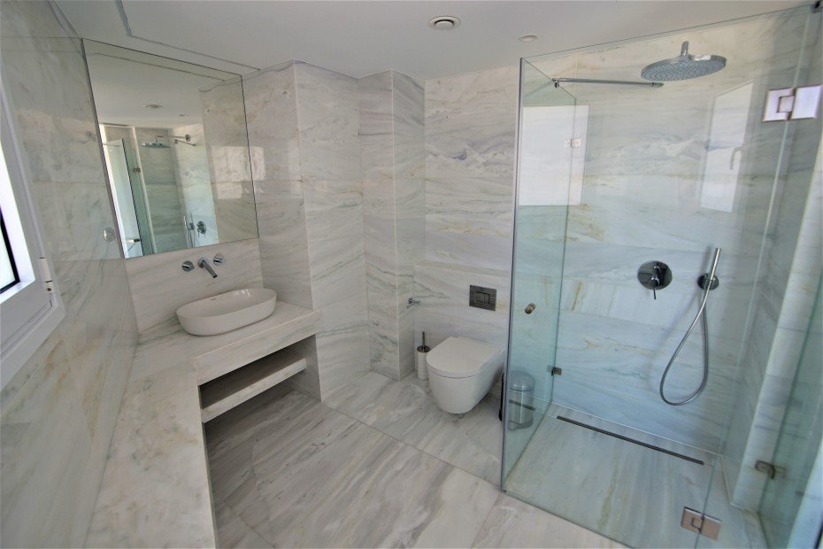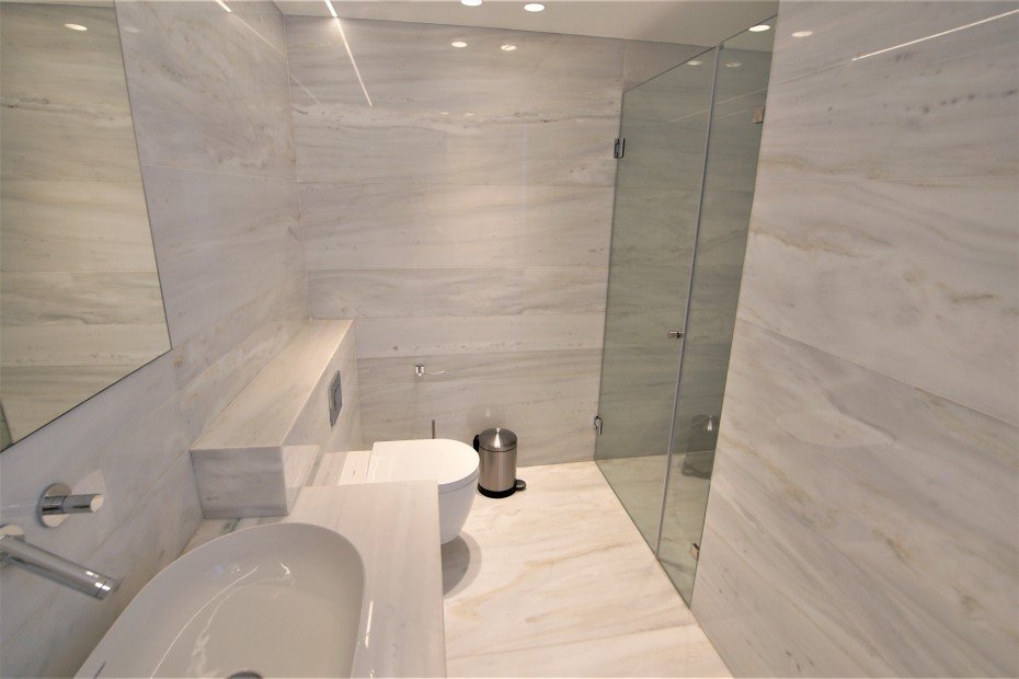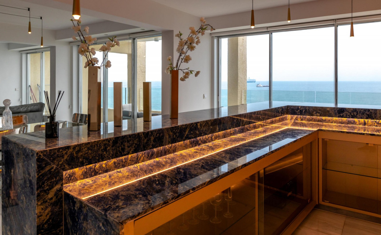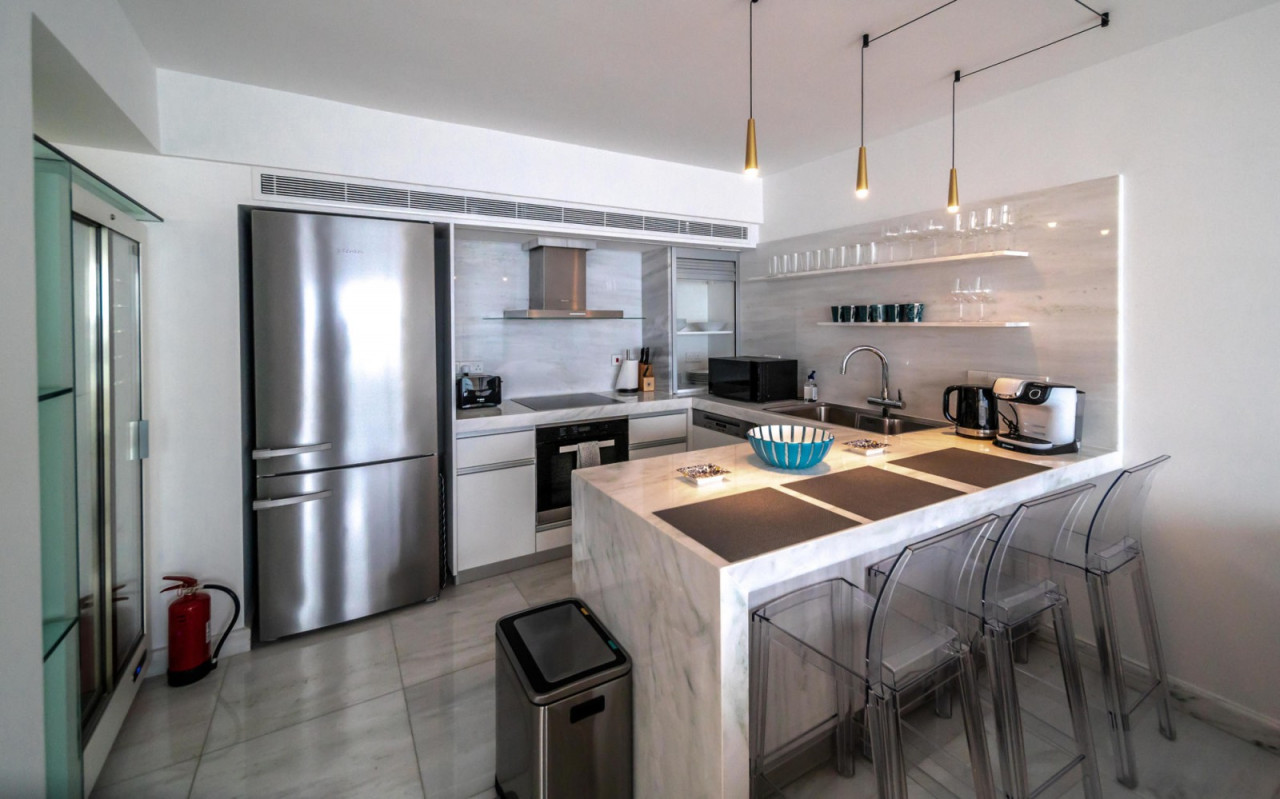 The apartment is on the 7th floor which is the top floor where it offers panoramic views from every corner with its floor to ceiling windows. Offered fully furnished to the highest standards. It consists of 3 bedrooms all with their own en suites and storage, a huge open plan space which consists of a fully equipped kitchen with Miele appliances, living area, dining area, bar and private covered balcony right opposite the sea.