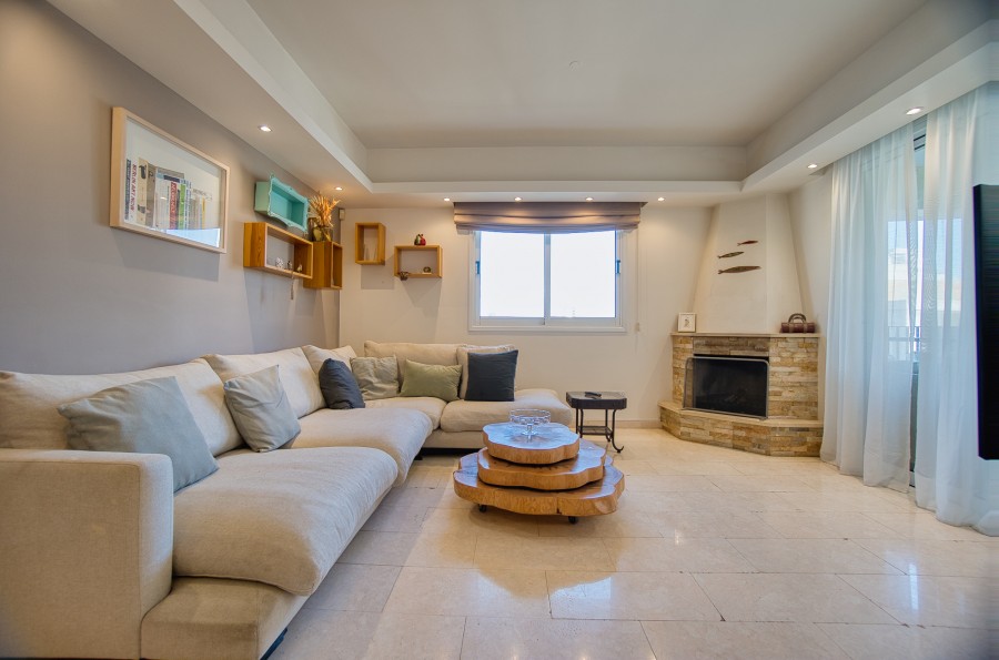 This well-planned, spacious 3-bedroom apartment, built in 2007, features an open-plan kitchen with a dining area, a cozy living space with a fireplace, and a covered veranda with an in-built BBQ area and facilities. It includes two bathrooms, a ground-floor storage room, and two parking spaces registered on the title deed.