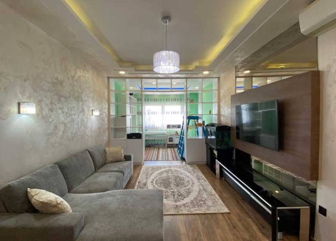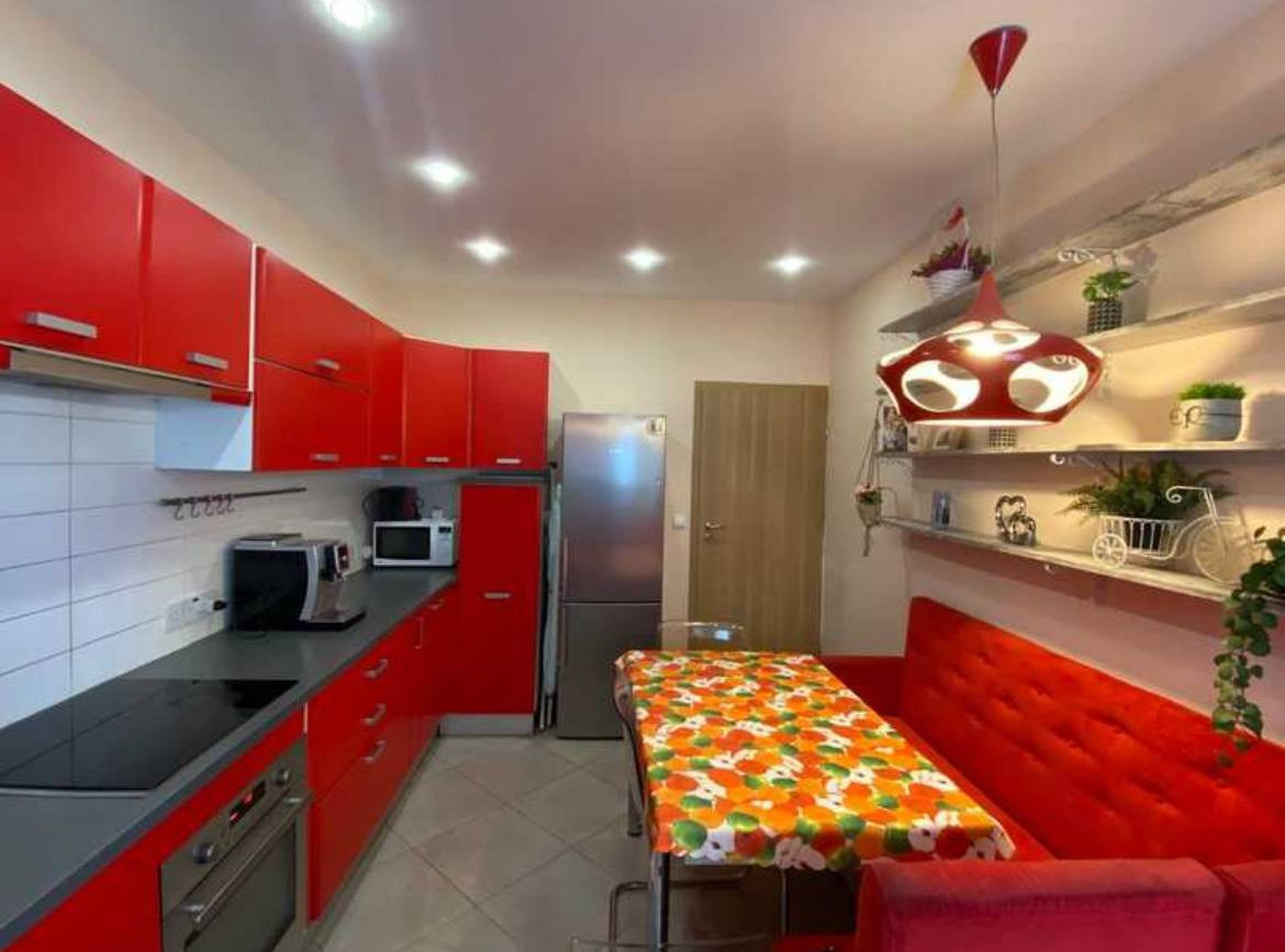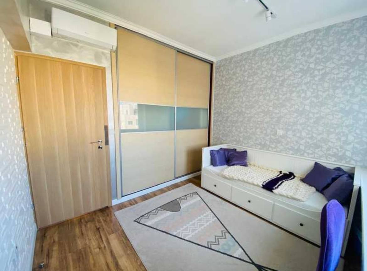 There is spacious living room, cozy bedrooms with new furniture and separated fully equipped kitchen that features an oven, cooker, laundry machine, refrigerator, and dishwasher.