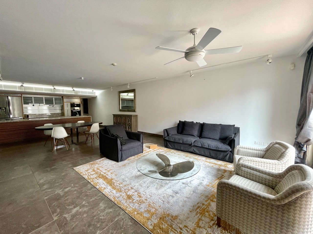 Living room with balcony and open plan kitchen