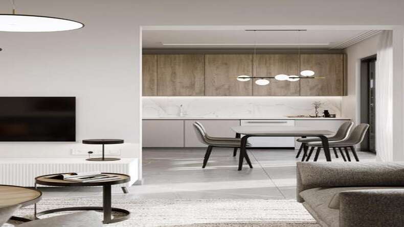 * Open plan lounge/kitchen with marble worktops