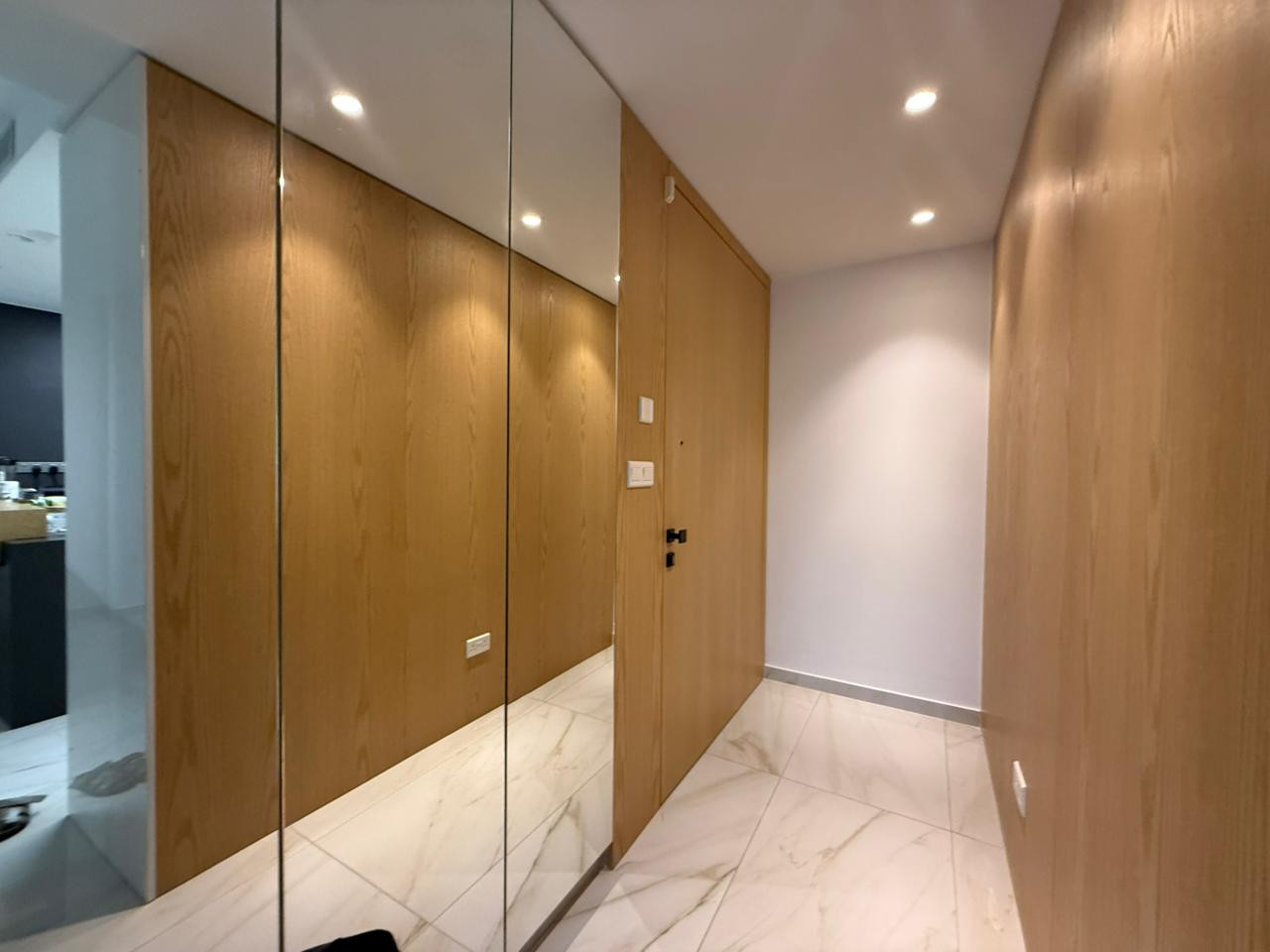 The open plan shared living space is fitted with a contemporary kitchen, that also encompasses the dining and living areas, it also features a home office space. The living room is fitted with seamless glass windows providing an unobstructed panoramic view. Riverside residence has one master bedroom with a walk-in closet and en-suite bathroom, and two bedrooms with built in closets that share a bathroom, in addition to a guest bathroom