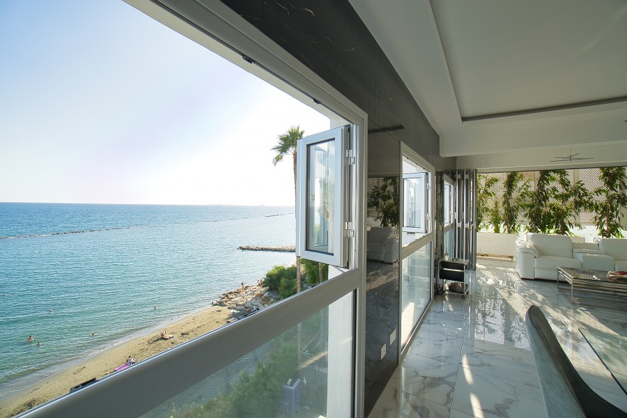 Luxury 3 bedroom apartment for sale in Germasogeia tourist area, Limassol. The property is located front line with amazing sea views throughout and a sandy beach within a few steps. Building has been recently renovated externally.