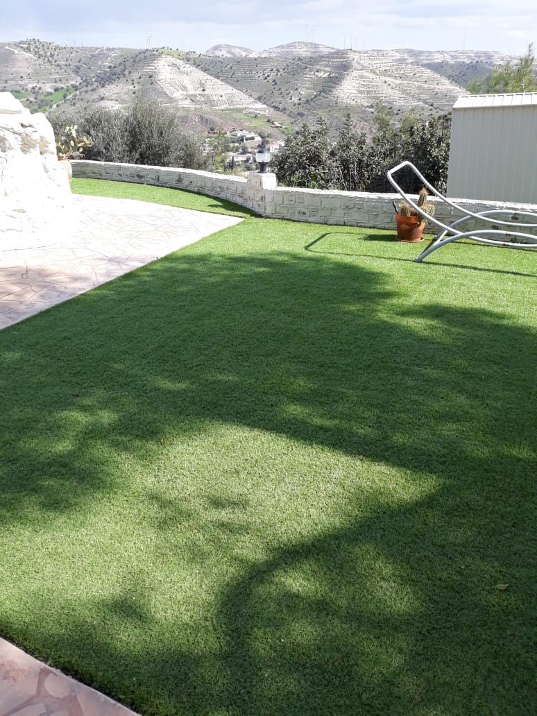 The lawns to the side of the house are artificial, needing very little maintenance.