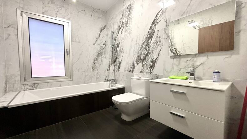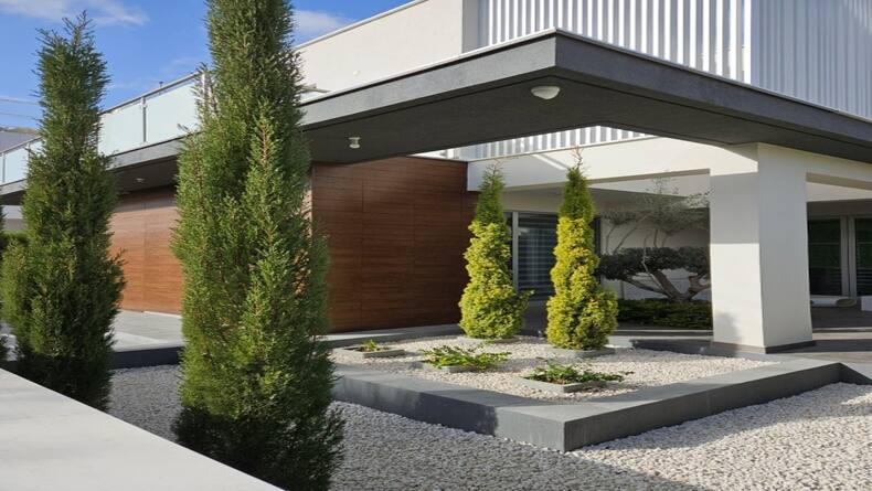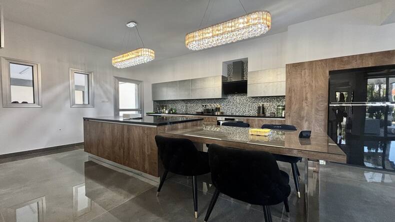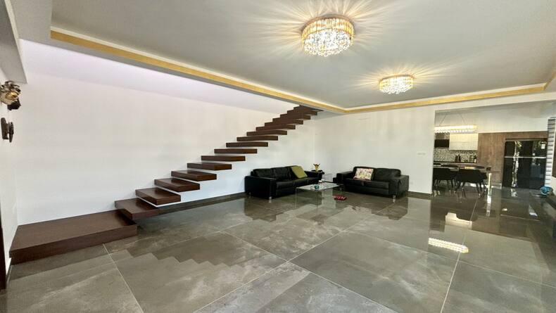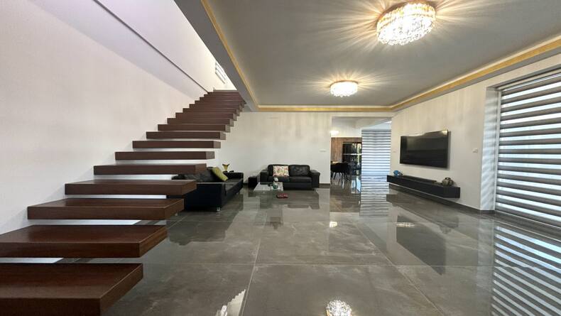 The house features a spacious and well-thought-out floor plan. On the ground floor, you'll find an Italian kitchen equipped with all essential appliances, a cozy garden with a central olive tree, and a guest WC. The living area is bright and airy, thanks to the panoramic windows that allow natural light to flood the space.