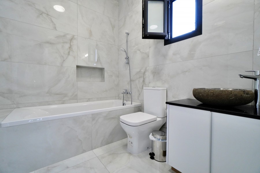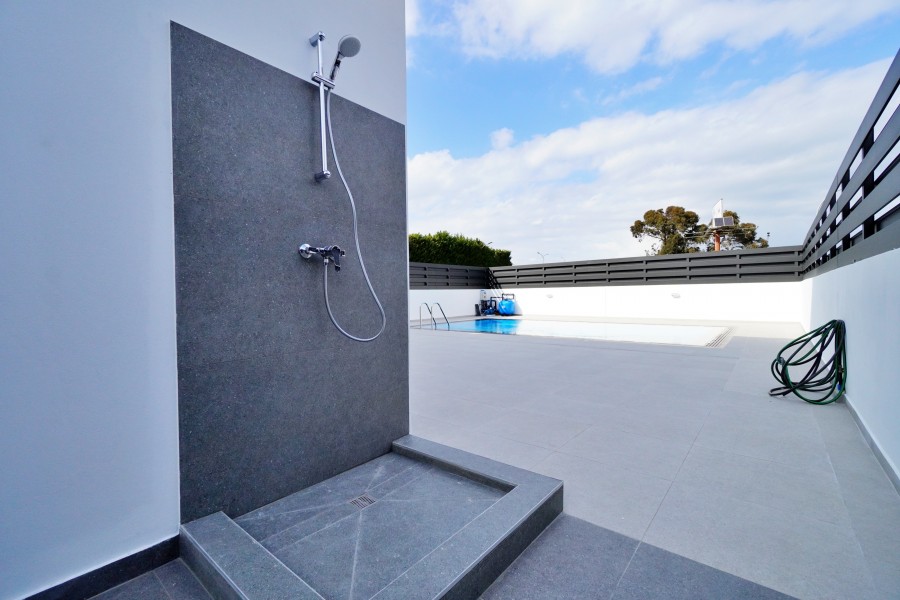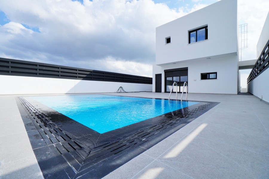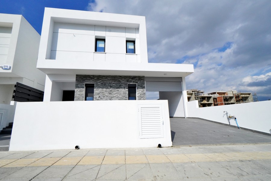 A brand-new 3-bedroom villa designed for luxury and comfort, featuring a large overflow pool and thoughtfully planned spaces for modern living in the area of Krassias. The open-plan living and dining area is complemented by a perfectly positioned kitchen, designed to maximize space while an elevated sitting area offers stunning views of the pool. A guest toilet is conveniently located on the ground floor. On the upper floor, you’ll find three spacious bedrooms, including a master suite with open wardrobes and a custom-designed ensuite bathroom with elegant stone elements. A large family bathroom and a separate laundry area add to the home’s functionality. One of the bedrooms enjoys access to a private outdoor space, offering the potential for a tranquil sitting area overlooking the open landscape. The property also boasts a large covered garage and a fully enclosed private outdoor area for enhanced privacy. Additional features include state-of-the-art electric shutters and surveillance system, ensuring security and peace of mind. This beautifully crafted villa is a perfect blend of style, privacy, and modern elegance, ideal for a refined lifestyle.