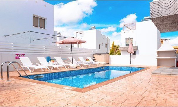 This beautiful villa is situated in a prime location at the heart of the touristic area of Ayia Napa, offering easy access to the town's restaurants, bars, shops, and other attractions. The villa is part of a gated community, ensuring privacy and security for you and your loved ones. The villa boasts three spacious bedrooms, each beautifully furnished with comfortable beds, stylish decor, and plenty of storage space. The master bedroom has a luxurious en-suite bathroom, while the other two bedrooms share a family bathroom. The villa is fully furnished and equipped with everything you need for a comfortable and enjoyable stay, including air conditioning throughout, Wi-Fi, and a fully equipped kitchen. One of the highlights of this villa is the stunning roof garden, offering breathtaking views of the surrounding area and the sea. The roof garden is the perfect place to relax and unwind, with comfortable seating, a barbecue area, and plenty of space for entertaining. Outside, you'll find a private garden area with a swimming pool and sun loungers, where you can soak up the sun and enjoy a refreshing dip in the pool. The villa also features a covered veranda with an outdoor dining area, perfect for al fresco meals and enjoying the warm Mediterranean climate. Whether you're looking for a peaceful retreat or a lively holiday experience, this villa is the perfect choice. With its prime location, top-notch amenities, and luxurious furnishings, this villa is sure to provide you and your loved ones with an unforgettable vacation experience in Ayia Napa. Title deeds are available for immediate transfer! Location: Nearest Beach: 800m Amenities: 100m Ayia Napa Marina: 4km