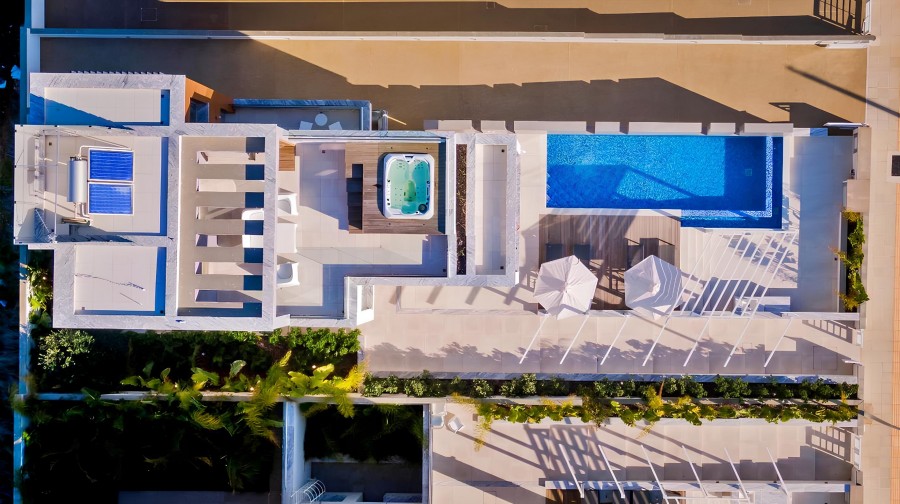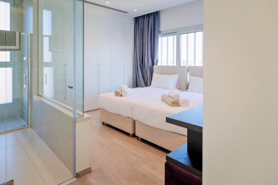 A stunning luxury villa in a prestigious area of Ayia Napa, part of an exclusive new development. Carefully positioned to offer privacy and tranquility, the villa is nestled in a prime location—secluded enough for peaceful living, yet close to all the conveniences of the vibrant resort town. Designed for a sophisticated homeowner, this elegant residence blends modern aesthetics with high-quality materials, creating a refined and durable living space. The ground floor features a spacious living area, a stylish kitchen, and a terrace with a private pool, perfect for relaxation and entertaining. The first floor hosts two ensuite bedrooms, while the second floor boasts a rooftop terrace with a jacuzzi and a third ensuite bedroom, offering breathtaking views of the surrounding landscapes. With velvety beaches on one side and serene fields on the other, this villa is an exceptional opportunity for those seeking the perfect blend of luxury, privacy, and coastal living in one of Cyprus' most sought-after locations.