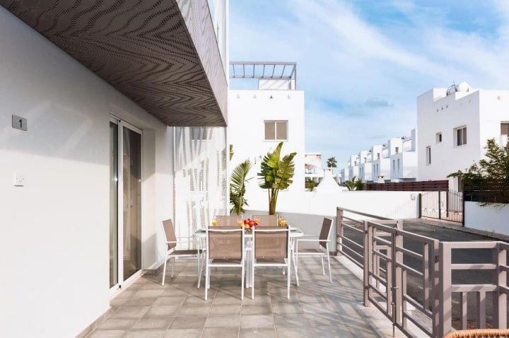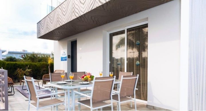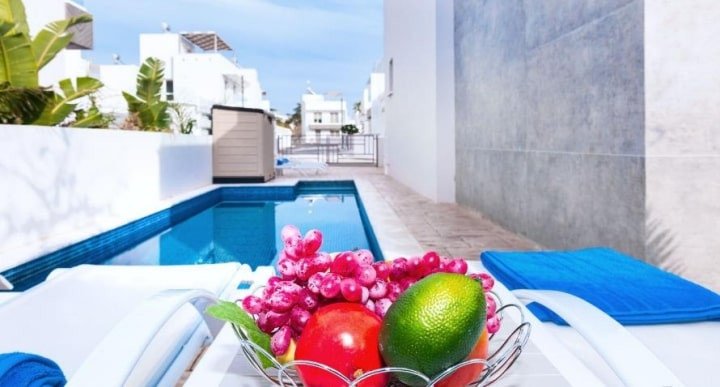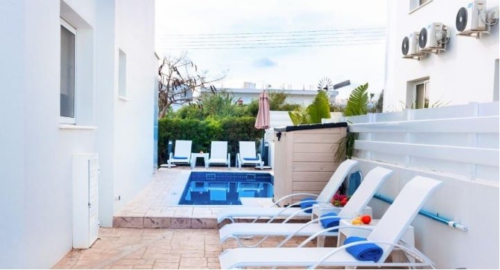 This gorgeous villa, designed with attention to detail, is located in the heart of Ayia Napa and only 500 meters from Sandy Bay Beach. The famous Nissi Beach is around 8-10 minutes’ walk from the villa.